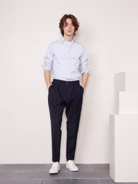 Plain front pant in 3ply wool. Slightly tapered fit. Pockets in the side seam. 4 holes covered buttons. Matching jacket available. - 100% virgin wool - Plain front - Self fabric belt - 4 holes self fabric covered buttons - Buttoned fly front opening - Italian virgin wool - Dry cleaning only - Made in Portugal This product sizes normally, we advise you to take your usual size. Our model measures 1m86 and wears a size 48. Exists in sizes 44 to 54. REF: W24MTLG463