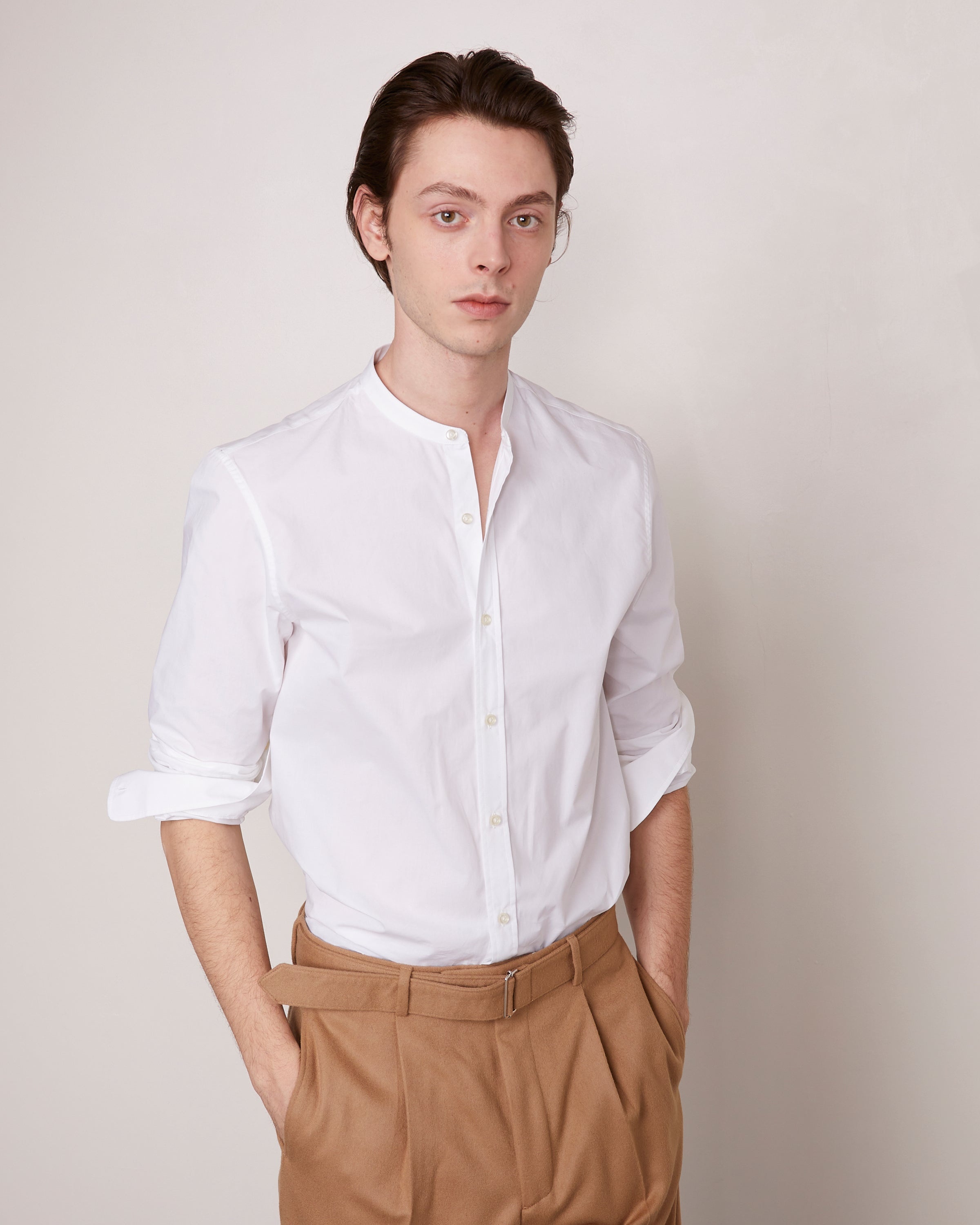 Band collar long sleeves shirt. Gathered pleats on cuffs. Single needle at side seam. Straight bottom with slits on sides. Garment wash - 100% cotton - Band collar - Gathered pleats on cuffs. - Single needle at side seam - Side slits - Straight bottom - Garment wash - cotton poplin - Machine washable with similar colors, 30°. - Made in Portugal This product sizes normally, we advise you to take your usual size. Our model measures 1m86 and wears a size S. Exists in sizes XS to XL. REF: W24MSHI029