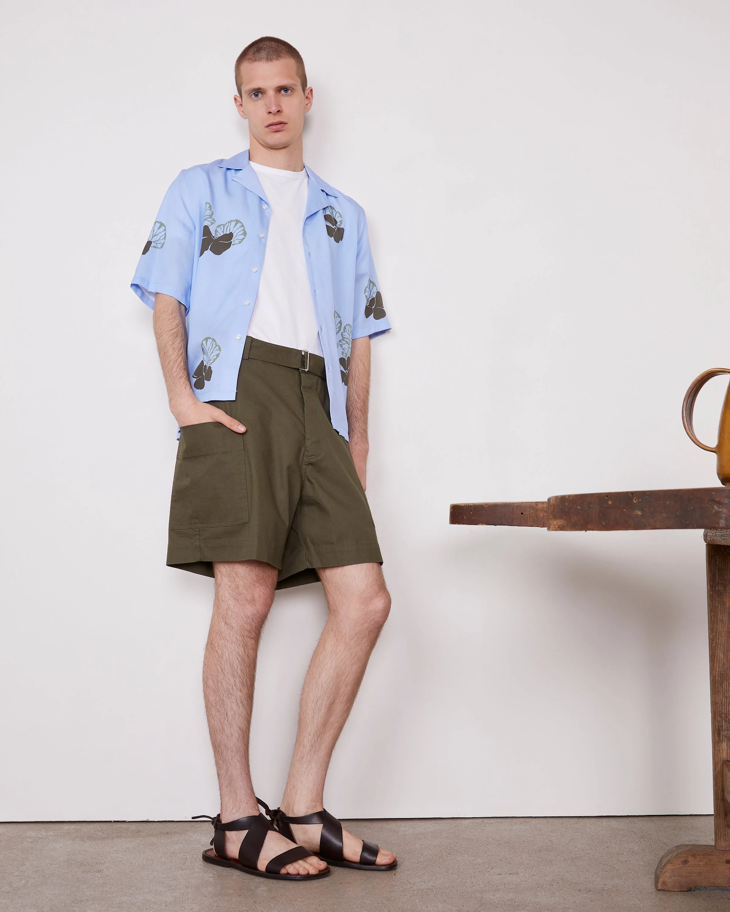 Short. Loose fit. Removable self fabric belt with bucle. 2 patch pocket on front. 2 flap pockets on the back. Garment wash. Exclusive Officine Generale color. - 97% Cotton 3% Elastane - Loose fit - Removable self fabric belt with bucle - 2 patch pockets on front - 2 flap pockets on the back - Garment wash - Exclusive Officine Generale color - Machine washable with similar colors, 30°. - Made in Portugal This product sizes normally, we advise you to take your usual size. Our model measures 1m86 and wears a size 48. Exists in sizes 44 to 54. REF: S25MSHT805