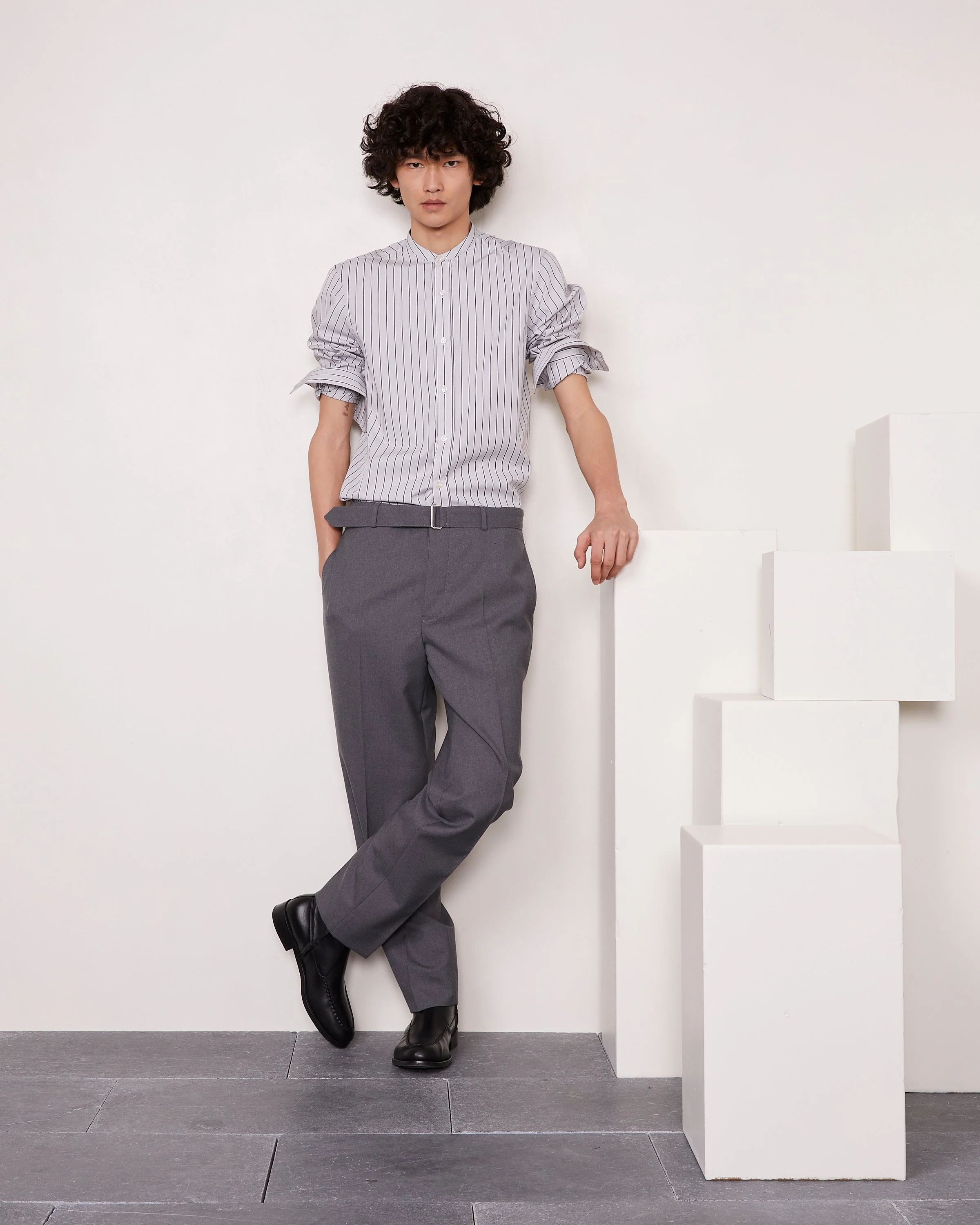 Band collar long sleeves shirt. Gathered pleats on cuffs. Single needle at side seam. Straight bottom with slits on sides. Garment wash - 100% cotton - Band collar - Gathered pleats on cuffs. - Single needle at side seam - Side slits - Straight bottom - Garment wash - japenese cotton - Machine washable with similar colors, 30°. - Made in Portugal This product sizes normally, we advise you to take your usual size. Our model measures 1m86 and wears a size S. Exists in sizes XS to XL. REF: W24MSHI030