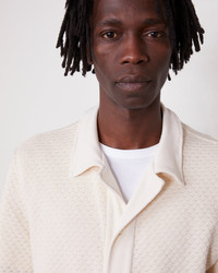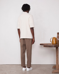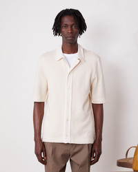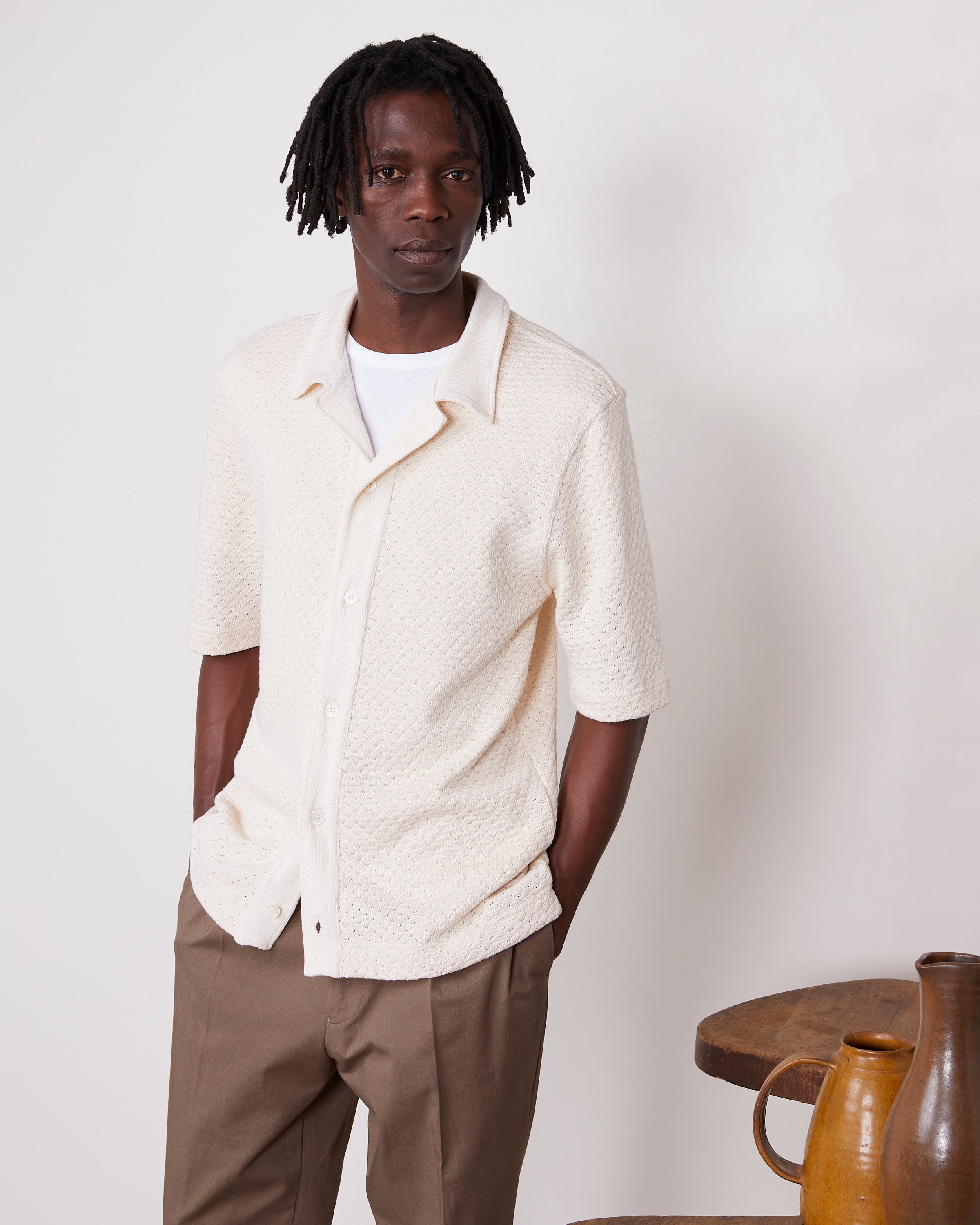 Short-sleeves sweat with camp collar. Front button placket and collar in plain jersey. Straight bottom with side slits. Textured cotton jersey. Garment wash. - 100% Cotton - Short sleeves - Camp collar - Front button - Placket and collar in plain jersey - Straight bottom with side slits - Textured cotton jersey - Garment wash - Machine washable with similar colors, 30°. - Made in Portugal This product sizes normally, we advise you to take your usual size. Our model measures 1m86 and wears a size S. Exists in sizes XS to XL. REF: S25MTEE223