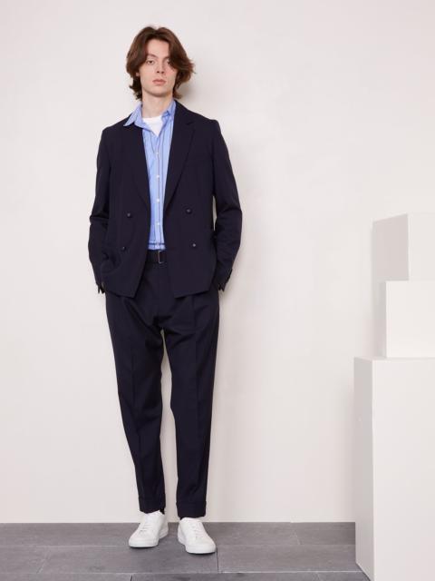 Double breasted four buttons jacket with notch lapels. Soft shoulder. Patch pockets, double vents at back. 4 holes self fabric covered buttons. Fully lined. Matching pants available. - 100% virgin wool - Double breasted - 4 buttons - 4 holes self fabric covered buttons - Soft shoulder - Patch pockets - Double vents at back - Fully lined - Fully lined - italian woll cashmere - Dry cleaning only - Made in Portugal This product sizes normally, we advise you to take your usual size. Our model measures 1m86 and wears a size 48. Exists in sizes 44 to 54. REF: W24MTLG421