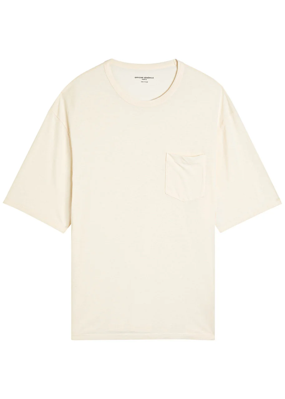 Info & Care Officine Generale jersey T-shirt; Ribbed crew-neck, patch pocket at chest Slips on; 67% Lyocell, 33% cotton; Machine wash Size & Fit Length shoulder to hem: 28.5 inches/ 72cm Midweight Loose, relaxed fit Model is 6'3"/ 191cm, chest size 38 inches and wears a size medium