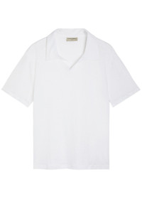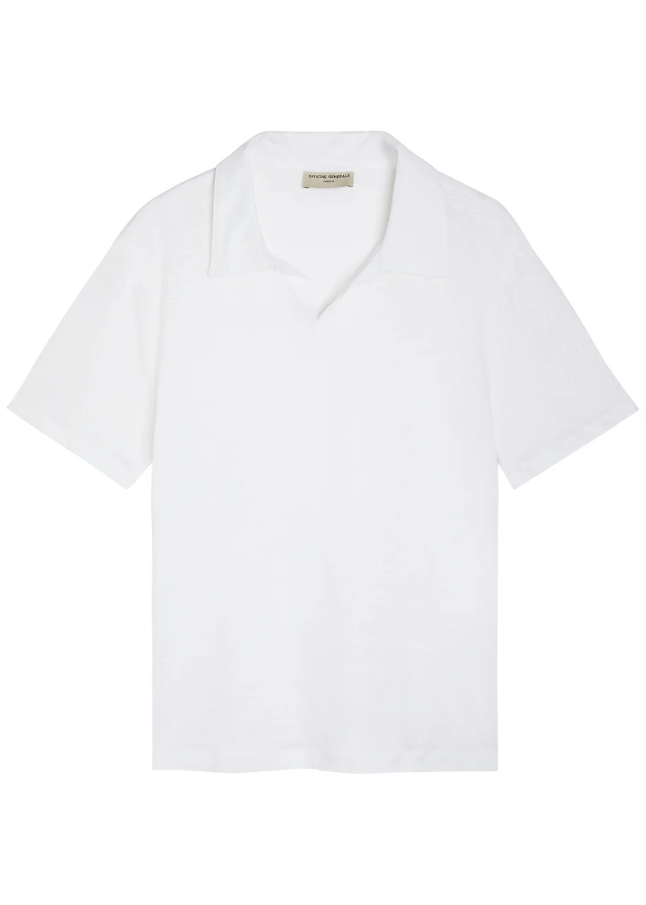 Info & Care Officine Generale linen T-shirt Camp collar, side splits; Slips on; 100% linen Hand wash; Size & Fit Length shoulder to hem: 27 inches/ 68.5cm Midweight Regular fit Model is 6'2"/ 188cm, chest size 38 inches and wears a size medium