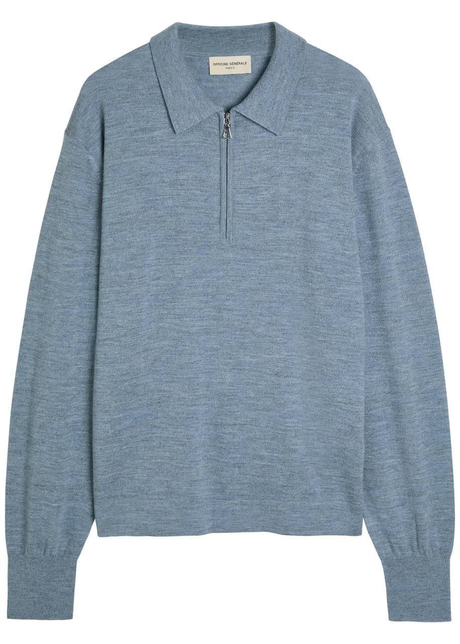 Info & Care Officine Generale merino wool polo jumper Melange, zip-fastening neck, side splits, ribbed trims; Slips on; 100% merino wool Hand wash; Size & Fit Length shoulder to hem: 26 inches/ 66cm Midweight Relaxed;fit Model is 6'2"/ 188cm, chest size 38 inches and wears a size medium