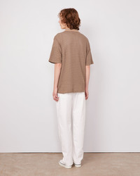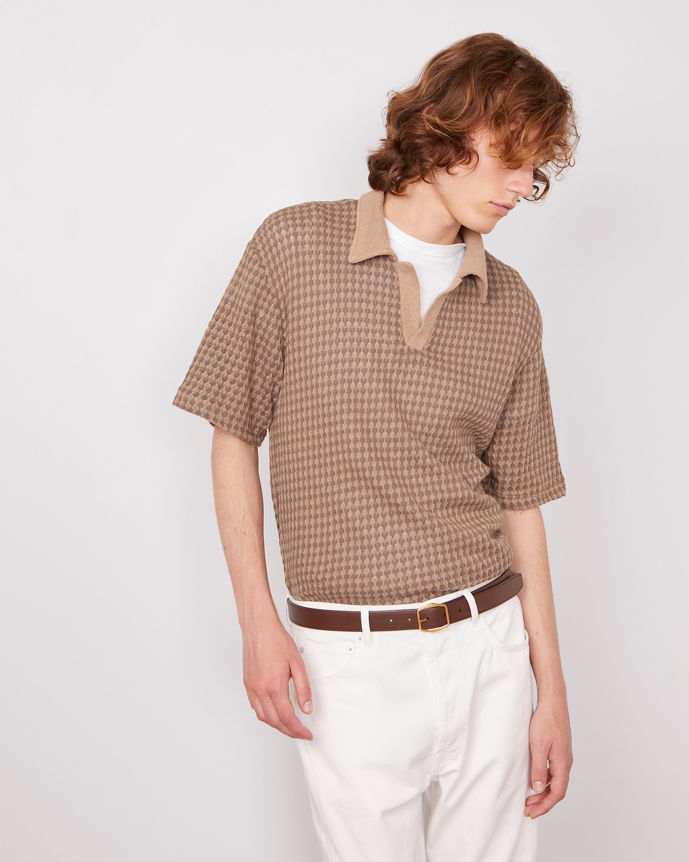 Short-sleeves with Johnny collar. Straight bottom with side slits. Oversize fit. Textured cotton jersey. - 100% Cotton - Short sleeves - Johnny collar - Straight bottom with side slits - Oversized fit - Textured cotton jersey - Machine washable with similar colors, 30°. - Made in Portugal This product sizes normally, we advise you to take your usual size. Our model measures 1m86 and wears a size S. Exists in sizes XS to XXL. REF: S25MTEE221