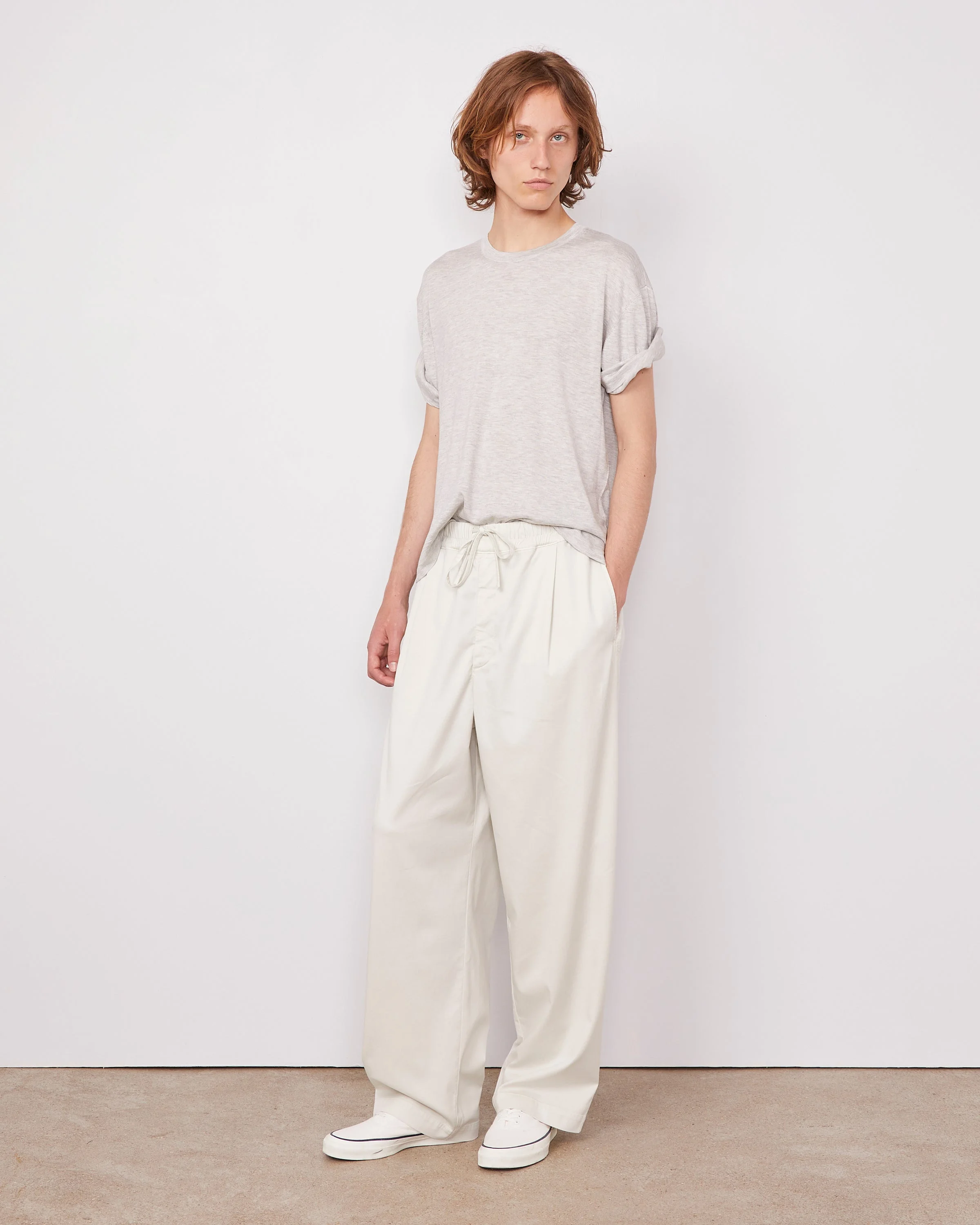 One pleat trouser with elasticated waistband. Loose fit with slightly curved leg. - 55% cotton 42% lyocell 3% elastane - One pleat - Self fabric drawstring - Side seam pockets - Patch pockets - Garment dye - Made in Tunisia - Dry cleaning only - Made in Tunisia This product sizes normally, we advise you to take your usual size. Our model measures 1m86 and wears a size 48. Exists in sizes 44 to 54. REF: S26MCHN704PRE