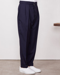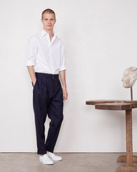 Two pleats pant. Loose at upper thigh and tapered at bottom. 5 CM hem cuffed. Removable self fabric belt. 4 holes covered buttons. Matching jacket available. - 100% Virgin Wool - Two pleats - Loose at upper tight - Tapered at bottom - 5CM hem cuffed - Removable self fabric belt - 4 holes self fabric covered buttons - Matching jacket available - Dry cleaning only - Made in Portugal This product sizes normally, we advise you to take your usual size. Our model measures 1m86 and wears a size S. Exists in sizes XS to XL. REF: S25MTLG460R