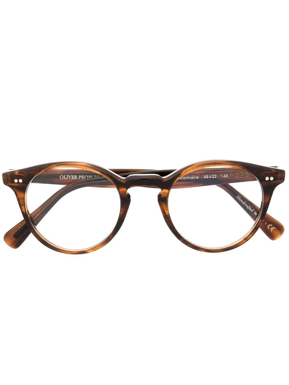 round-frame glasses brown round frame clear lenses straight arms curved tips All glasses from FARFETCH are sold as non-prescription frames. These glasses come with a protective case. Made in Italy Composition Acetate 100% SIZE & FIT Measurement Arm Length 5.7 in(14.5 cm) Bridge Width 0.86 in(2.2 cm) Lens Diameter 1.88 in(4.8 cm) Total Width 5.51 in(14 cm)