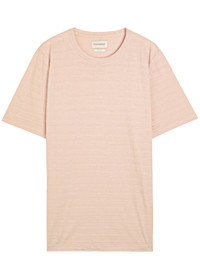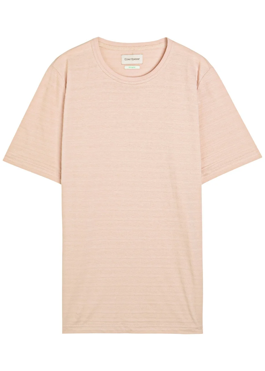 Info & Care Oliver Spencer knit T-shirt; Striped details, ribbed crew-neck, designer tag at side Slips on; 45% cotton, 45% modal, 8% polyester, 2% elastane; Machine wash; Size & Fit Length shoulder to hem: 27 inches/ 68.5cm Midweight; Slightly relaxed fit; Model is 6'2"/ 188cm, chest size 38 inches and wears a size medium