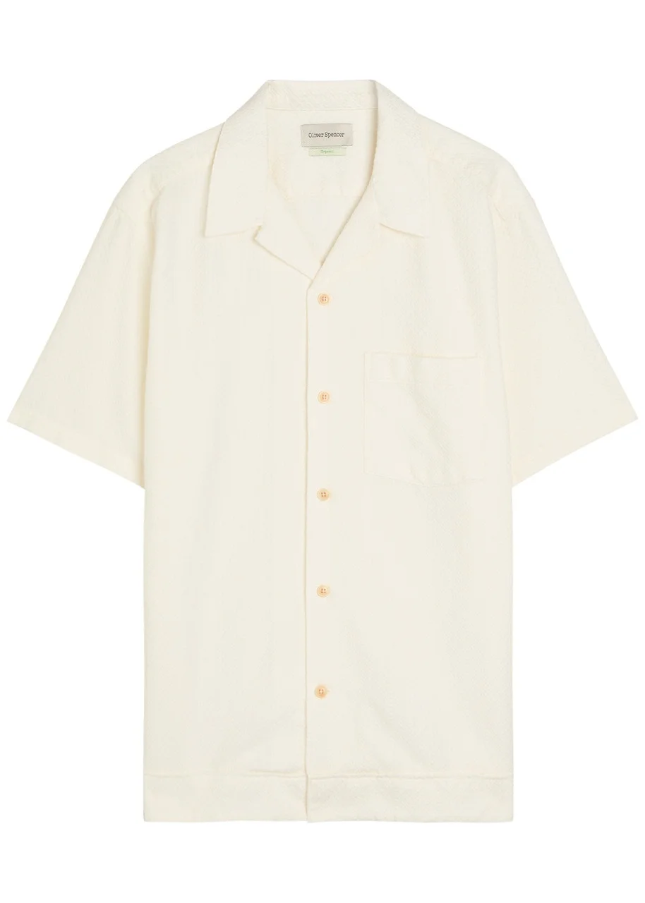 Info & Care Oliver Spencer;cotton shirt Jacquard,;camp collar,;chest patch pocket,;side splits, longer back hem Button fastenings through front 100% organic cotton Machine wash Size & Fit Length shoulder to hem: 27 inches/ 68.5cm; back: 28 inches/ 71.5cm Midweight Loose fit Model is 6'2"/ 188cm, chest size 38.5 inches and wears a size medium