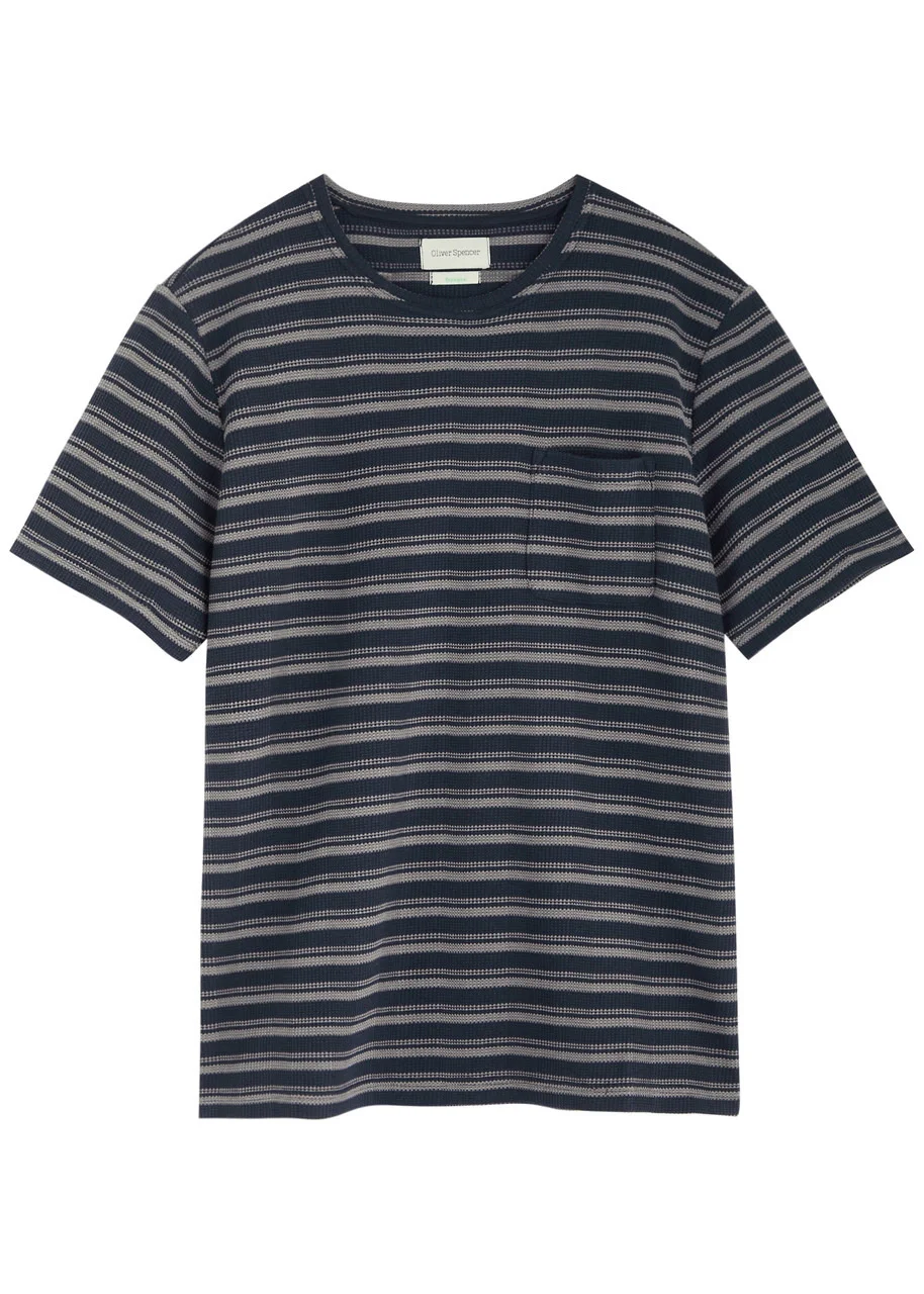 Info & Care Oliver Spencer knitted T-shirt; Waffle-knit, striped intarsia, crew-neck, dropped shoulders, chest patch pocket, designer tag at side Slips on; 45% cotton, 45% modal, 8% polyester, 2% elastane; Machine wash; Size & Fit Length shoulder to hem: 28 inches/ 71cm Midweight; Relaxed fit; Model is 6'3"/ 191cm, chest size 38 inches and wears a size medium