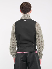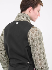 OLLY SHINDER vest in black, waistcoat design, paneled Cordura nylon construction, plunging neckline, shawl-style collar, back logo embroidery, sleeveless, armscyes, side adjustable straps, front buttoned closure, front welt pockets, straight hem, slim fit. Made in UK 100% Cordura Nylon Standard Sizing Model is 6’0” wearing size M. Shoulders: 19" Chest: 38” Waist: 30”