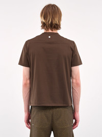 OMAR AFRIDI t-shirt in brown, paneled jersey construction, crewneck, back signature button hardware, short sleeves, straight hem, slim fit. Italian Sizing Model is 6'1.5" wearing size 48. Shoulders: 18.5" Chest: 37" Waist: 31"