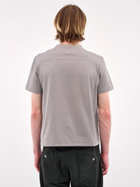 OMAR AFRIDI t-shirt in grey, paneled jersey construction, crewneck, back signature button hardware, short sleeves, straight hem, slim fit. Italian Sizing Model is 6'1.5" wearing size 48. Shoulders: 18.5" Chest: 37" Waist: 31"
