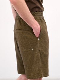 OMAR AFRIDI shorts in dirty yellow, paneled knit construction, rib-knit, elasticated waistband, side pockets, back welt pockets, rivet detailing, straight hem, knee-length, wide leg, relaxed fit. Italian Sizing Model is 6'1.5" wearing size 48. Shoulders: 18.5" Chest: 37" Waist: 31"