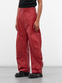Red coated canvas trousers with a wide, structured leg. Signature buttons and a concealed fly refine the utilitarian construction. Featuring: • Loose fit • Canvas construction with coated finish • Belt loops • Concealed zip fly closure • Side and back pockets • Signature button detailing • Wide leg • Made in UK • 93% Cotton 7% Polyurethane • Italian sizing Model is 5'11.5" wearing size 48. Shoulders: 18" Chest: 36" Waist: 30"