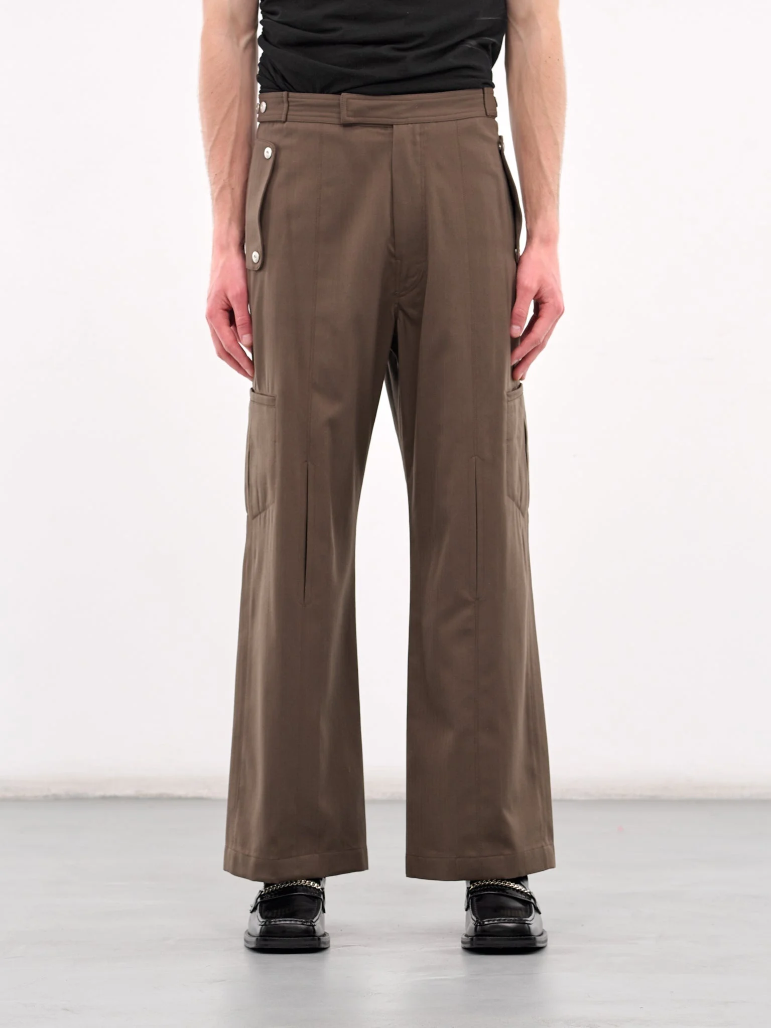 OMAR AFRIDI pants in sand, paneled construction, side buttoned straps, signature buttons, front concealed zip fly closure, side buttoned flap pockets, back buttoned flap pockets, side cargo pockets, wide leg, loose fit. Italian Sizing Model is 6'1.5" wearing size 48. Shoulders: 18.5" Chest: 37" Waist: 31"