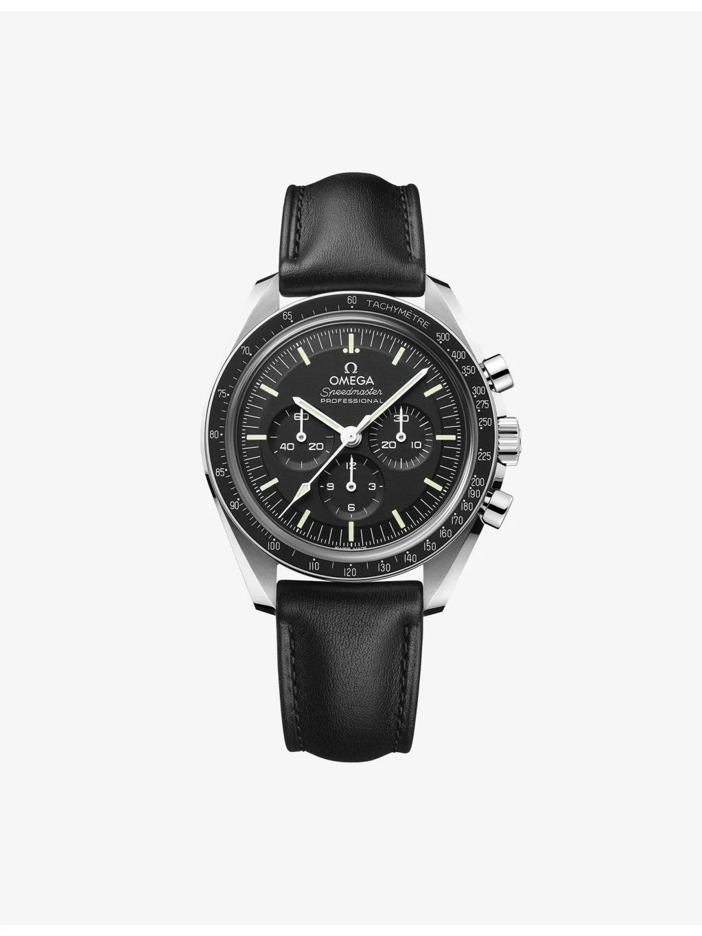 PRODUCT DETAILS - OMEGA watch - Case: 100% steel - Bezel 100% anodised aluminium - Strap: 100% leather strap - Style number: 310.32.42.50.01.002 - Movement: manual‑winding movement - Fastening: fold over stainless steel clasp - Glass: Domed, scratch‑resistant sapphire crystal with anti‑reflective treatment inside - Dial: black - Hands: Brass Nickel with White Paint and Super-LumiNova - Indexes: Rhodium-plated with Super-LumiNova - Calibre: Omega 3861 - Power reserve: 50 hours - Technical details: Anti-magnetic, chronograph, chronometer, master chronometer certified, small seconds, tachymeter, transparent caseback - Case Diameter: 42 mm - Between lugs: 20 mm - Lug to lug: 47.50 mm - Thickness: 13.18 mm - Water resistance: 5 bar / 5 atm / 50m / 165ft - Made in: Switzerland - Care: please refer to the brand's instructions Ref: R04361886