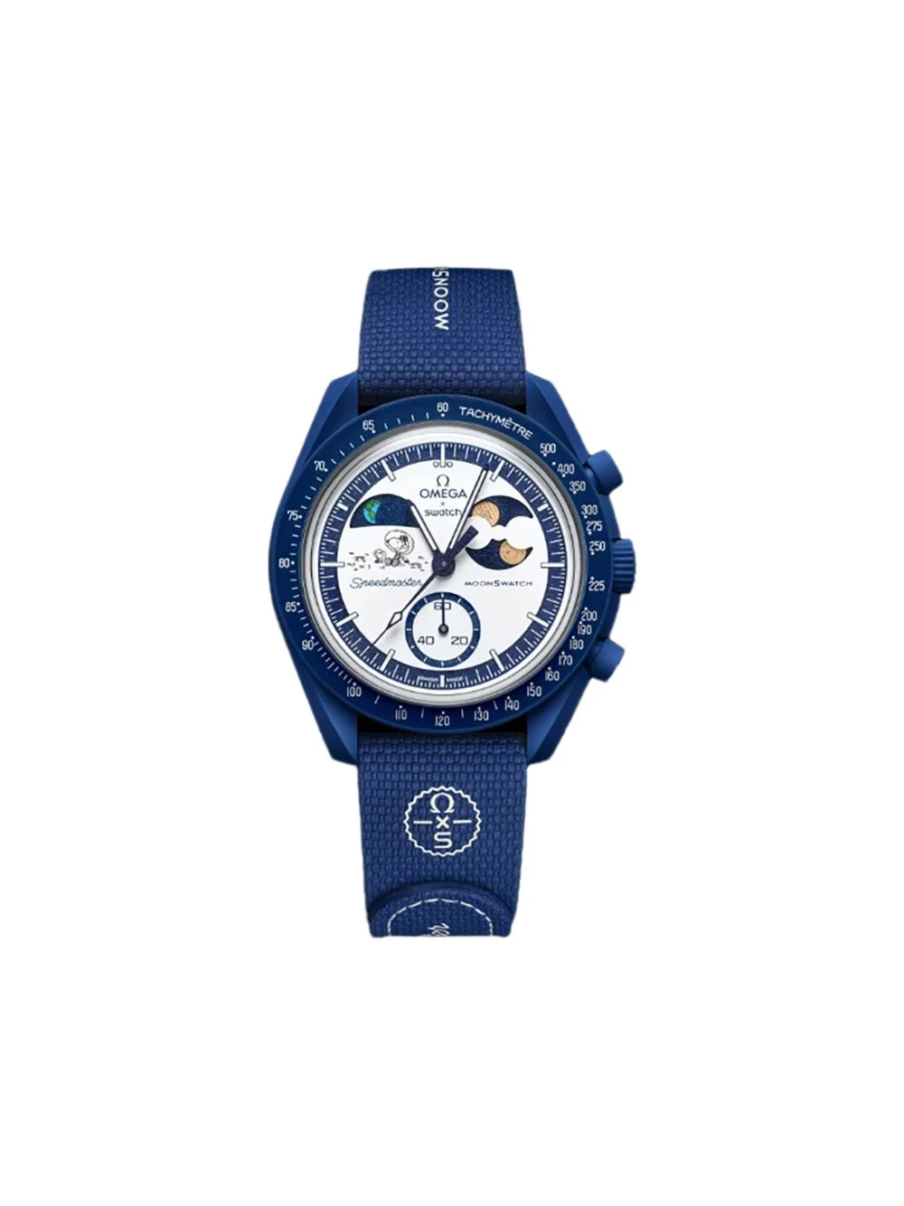x Swatch Bioceramic Moonphase 42mm watch Highlights - White-dial - Round case - Chronograph dial - Tachymeter bezel - Quartz movement - This item comes with a standard one-year warranty from the boutique. Imported Composition ceramic 100%, Rubber 100% SIZE & FIT Measurement DIAMETER 1.65 in(4.2 cm)