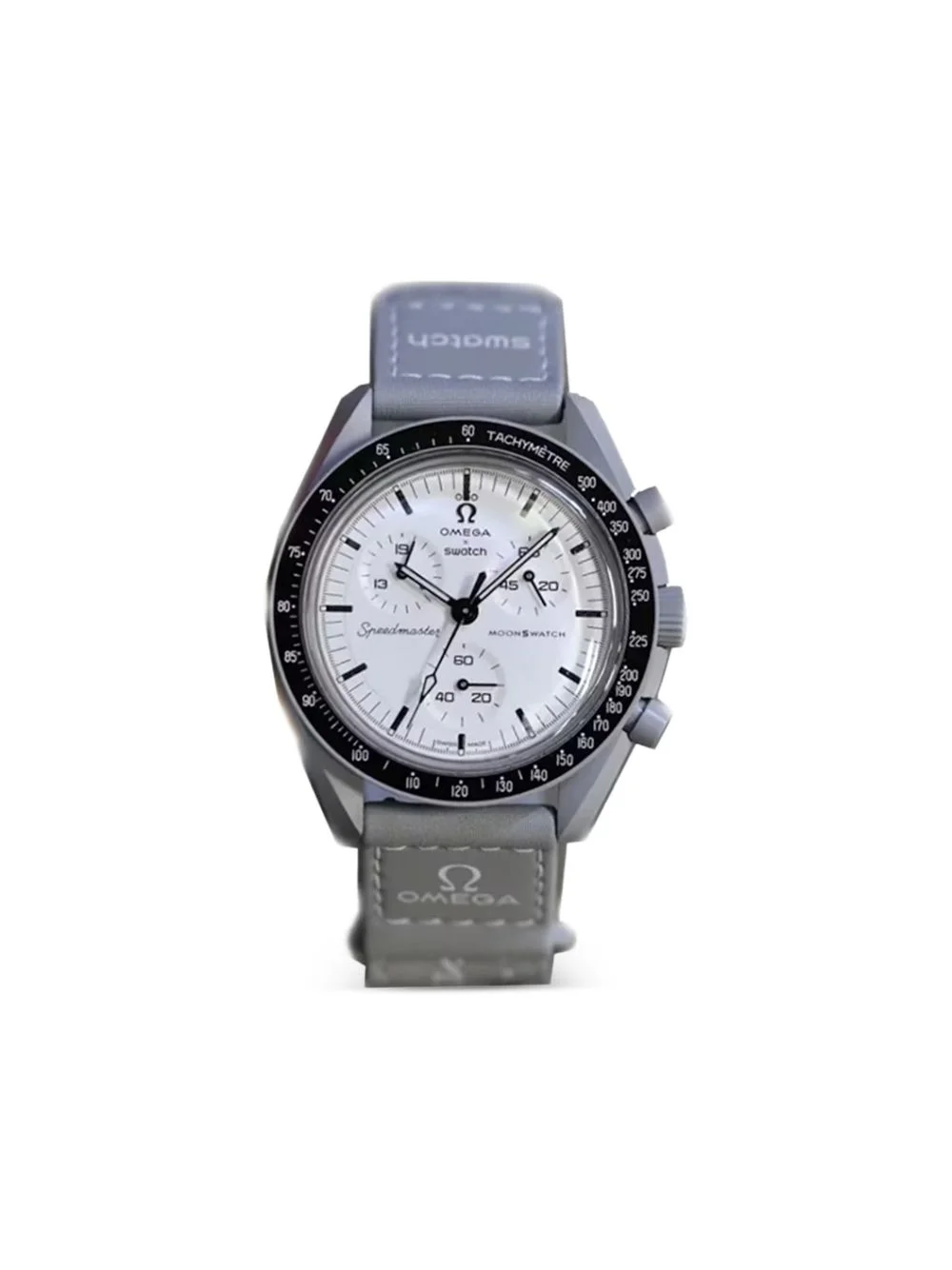 x Swatch Bioceramic Moonswatch 42mm watch Highlights - White-dial - Round case - Chronograph dial - Tachymeter bezel - 3 sub-dials - Standard crown - Quartz-movement - This item comes with a standard one-year warranty from the boutique. Imported Composition ceramic 100%, Fabric 100% SIZE & FIT Measurement DIAMETER 1.65 in(4.2 cm)