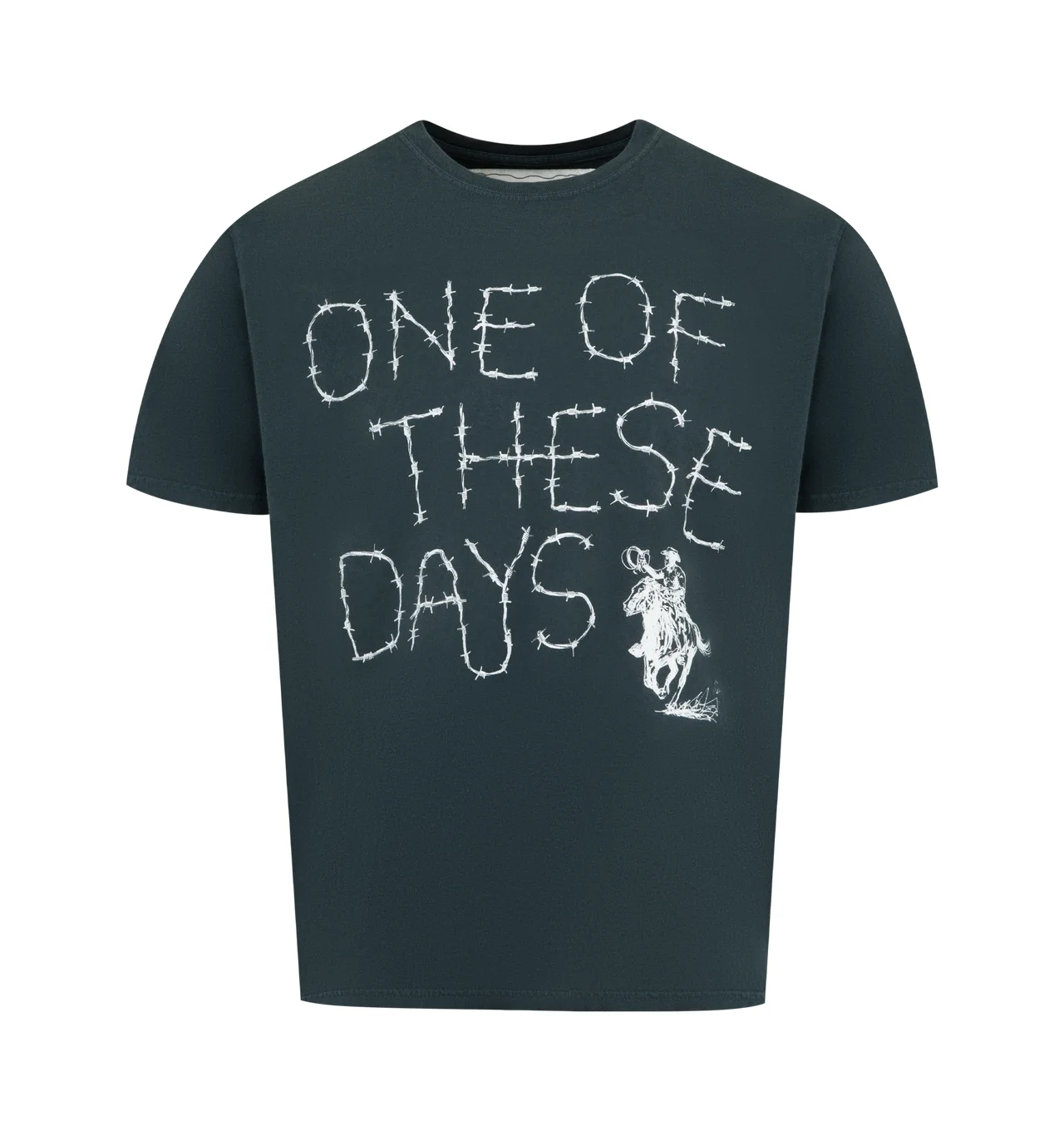 ONE OF THESE DAYS Barbed Graphic T-Shirt featuring abarbed-wire motif across the front, crewneck and short sleeves. 100% cotton. Made in the USA. DESIGNER STYLE ID: 02C-04-064 COLOR: HARD WASHED BLACK