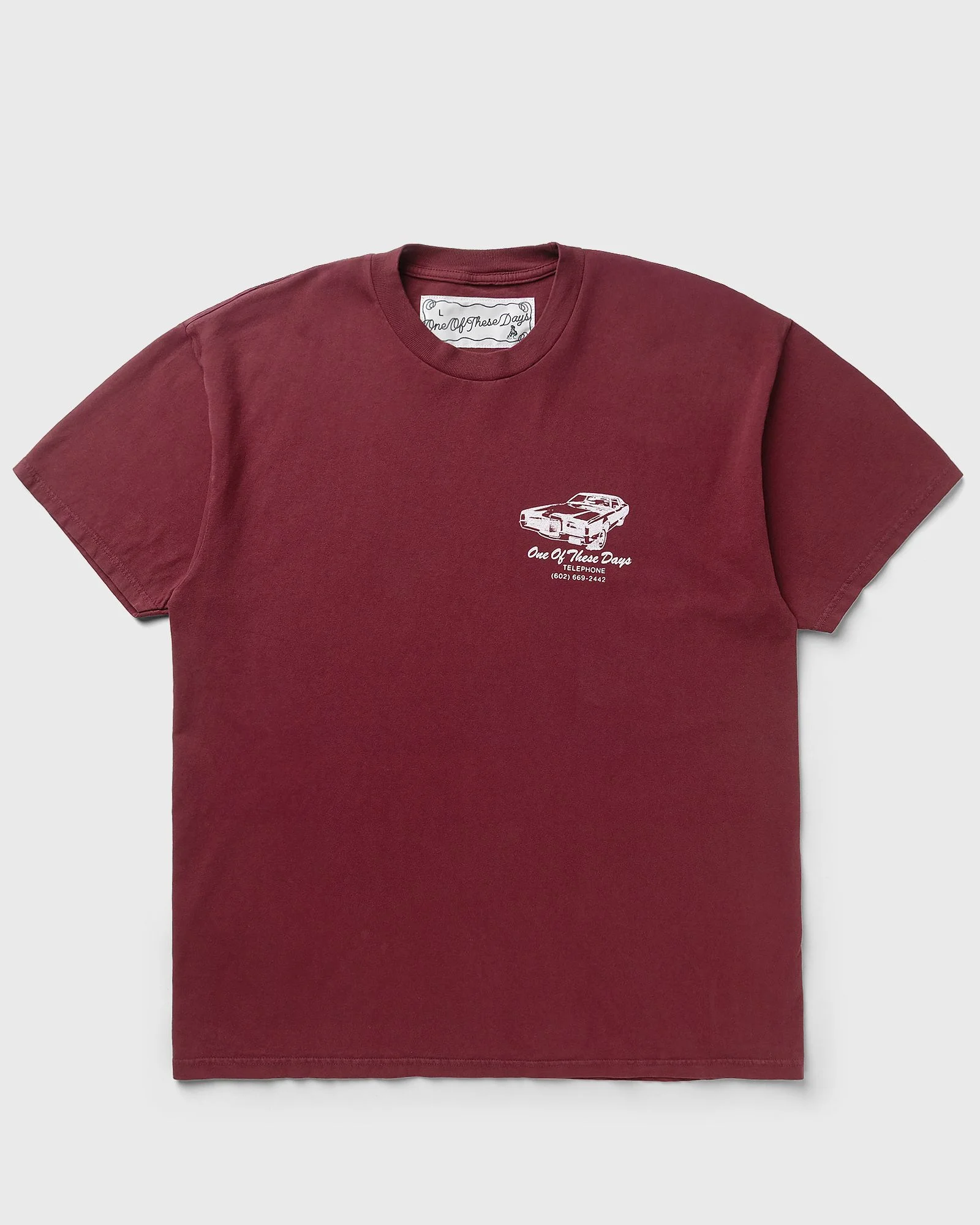 The One of these Days TIRE SERVICE TSHIRT is perfect for any occasion and creates a casual look. The comfortable material and loose cut make it the ideal companion for everyday wear. - Ribbed round neck collar - Short sleeves - Graphic print - Vintage wash - Pre-shrunk Article number: 01C-04-028-WASHED-BURGUNDY Gender: men Color: WASHED BURGUNDY Material: 100% Cotton