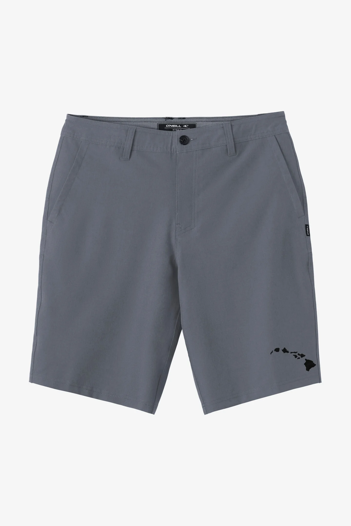 Our classic hybrid short, designed with stretch fabric and water-resistant technology for maximum comfort in any environment. - Men's Fixed Waist Hybrid Short - 20'' Outseam, 10'' Inseam – At-the-Knee Fit - Hyperfreak Pro Stretch With Repreve; 52% Recycled Polyester, 36% Polyester, 12% Elastane - Hawaii Branding at Left Lower Leg - O'Neill Hyperdry DWR Technology - Zipper Fly - Internal Tunnel Drawcord - Front Hand Pockets With Zippers - Back Welt Pockets - Hawaii Collection SKU: SP2618A14|GRY