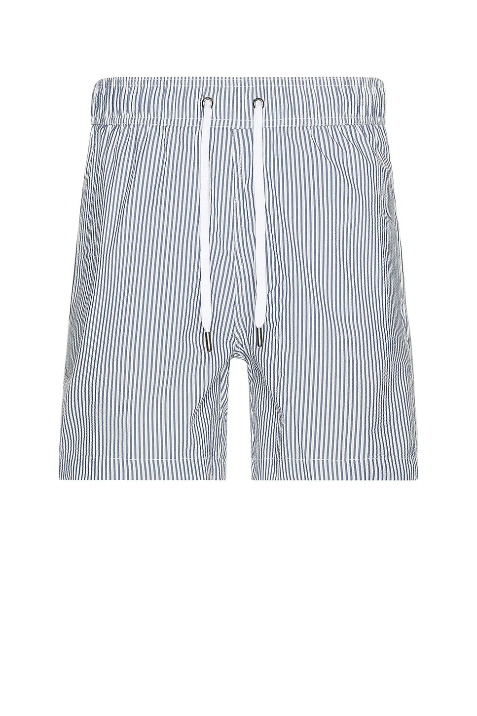- Self: 100% polyester Lining: 90% nylon 10% spandex - Made in China - Hand wash - Attached mesh lining - Elastic drawstring waistband - Side slip pockets and single back zipper pocket - Seersucker textile - Shorts measure approx 16" in length - Revolve Style No. ONIR-MX11 - Manufacturer Style No. MSB01-63