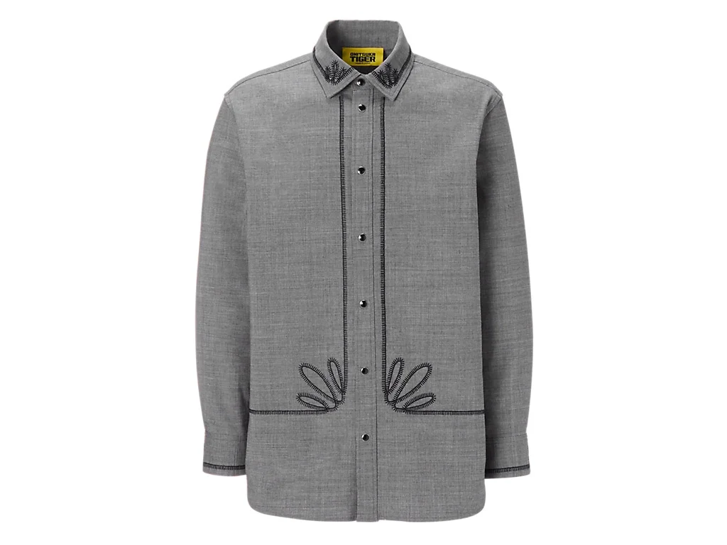 AW25 Collection A men's shirt crafted from matte, crisp fabric featuring an embroidered design ■Striking decorative blanket stitching Inspired by western shirts, this design incorporates classic details while being modernly arranged. The collar, front panel, sleeve hems, and lower back feature black decorative blanket stitching, creating a unique and eye-catching design. Stone and metal snap buttons are used at the openings on the front and sleeves, adding a subtle presence. -Made in Japan ■About AW25 Collection The theme of the 2025 Autumn/Winter Yellow Collection is "Urban Duality", inspired by the city of Tokyo where tradition and modernity collide. 【Size ( measurement : cm )】 S ) Centre back length: 70.5 Shoulder to Shoulder: 44 Chest: 113.6 Sleeve Length: 58 M ) Centre back length: 72.5 Shoulder to Shoulder: 46 Chest: 119.6 Sleeve Length: 60 L ) Centre back length: 74.5 Shoulder to Shoulder: 48 Chest: 125.6 Sleeve Length: 62 XL ) Centre back length: 76.5 Shoulder to Shoulder: 50 Chest: 131.6 Sleeve Length: 64 DETAIL INFORMATION - Brand: ONITSUKA TIGER - Country of Manufacture: Japan - Part No: 2181B037 - 2181B037.020 GREY/BLACK - Quality: Polyester68% Wool29% Elastane3%