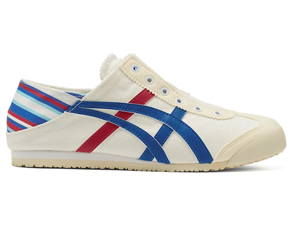 Our iconic MEXICO 66 PARATY style is a convertible version of our iconic MEXICO 66 model. It can be worn as either a slip-on, sans laces or as a mule/babouche. The MEXICO 66 model combines the features of the original LIMBER-UP training shoe that debuted in 1961 and the design of Limber shoe debuted in 1966, as one of the first models that featured the iconic Onitsuka Tiger Stripes. -Canvas upper -OrthoLite inner sole for superior cushioning *The model is laceless shoes DETAIL INFORMATION - Brand: Onitsuka Tiger - Country of Manufacture: Indonesia - Part No: 1183C316 - 1183C316.100 WHITE/CLASSIC BLUE - Upper material/surface: Canvas×Synthetic Leather×Synthetic Fiber - Outer Sole Material: Rubber