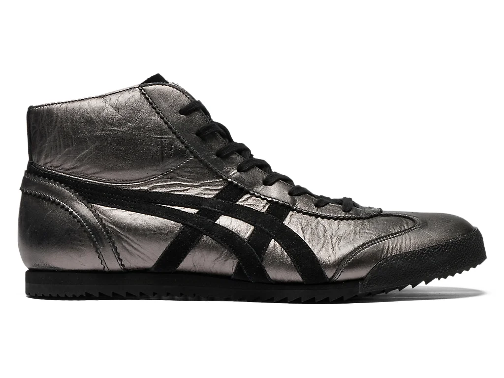 The "MEXICO MID RUNNER™ DELUXE" shoe features vintage processing by skilled Japanese artisans. ■Design Crafted from premium Japanese cow leather with a unique foil finish, sections are partially rubbed off by hand to create a distinctive texture. The washed finish adds to its vintage appeal. ■Details - The sockliner features materials with different hardness: ・A soft material near the foot for cushioning ・A hard material around the heel and arch for stability and support - Made in Japan DETAIL INFORMATION - Brand: NIPPON MADE - Country of Manufacture: Japan - Part No: 1181A608 - 1181A608.021 GUNMETAL/BLACK - Upper material/surface: LEATHER - Outer Sole Material: RUBBER