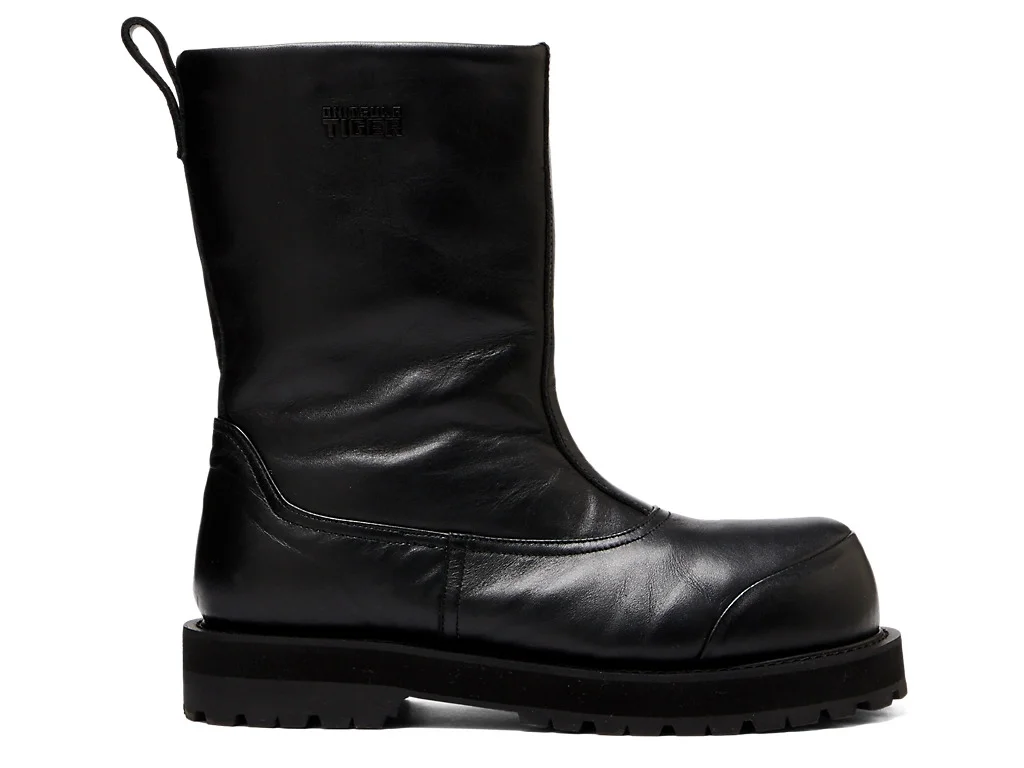 An elegantly finished boots inspired by archives, design of specialty cold weather work shoes for Antarctic expeditions. These boots are crafted from premium leather and boast a voluminous toe that is their signature feature. They are simplistic yet sophisticated, with metal logo accents on the sides and welted soles. -Leather upper -Metal logo -Made in Japan DETAIL INFORMATION - Brand: ONITSUKA TIGER - Country of Manufacture: Japan - Part No: 1183C148 - 1183C148.001 BLACK/BLACK - Upper material/surface: Leather upper - Outer Sole Material: RUBBER