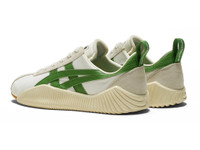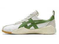 Inspired by the design of spiked track shoes from the 1970s, we introduce this new model in a leather and fabric combination with chic vintage touches. The slim silhouette of the toe is paired with a voluminous sole, similar to that of the 1970s track shoes. The sole has been updated to better suit a modern lifestyle; it is constructed with a combination of lightweight sponge and rubber. The oversized Onitsuka Tiger Stripes in contrasting colors accentuate the classic upper design. - Fabric and leather upper - fuzeGEL technology in heel for superior cushioning - OrthoLite X40 inner sole for bounce-like fit and soft ground impact DETAIL INFORMATION - Brand: Onitsuka Tiger - Country of Manufacture: Vietnam - Part No: 1183B257 - 1183B257.105 CREAM/SPINACH GREEN - Upper material/surface: Synthetic fiber×Leather×Faux leather - Outer Sole Material: RUBBER