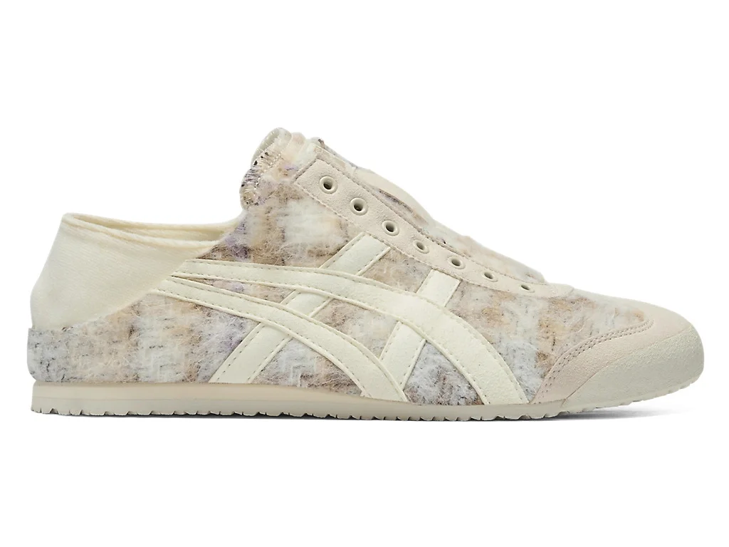 The "MEXICO 66 PARATY" features a 2-way design that allows you to wear it with the heel pressed down, and now it's available in a new version with Italian recycled wool. This shoe blends casual and refined style, with soft, long-furred fabric and a checkered pattern that adds warmth to your look. Additionally, the cushioned insole provides exceptional comfort, even during long walks. A versatile pair that shines in both relaxed settings and stylish outfits, making it perfect for various occasions. *The model is laceless shoes DETAIL INFORMATION - Brand: Onitsuka Tiger - Country of Manufacture: Indonesia - Part No: 1183C309 - 1183C309.200 BIRCH/IVORY - Upper material/surface: SYNTHETIC FIBER - Outer Sole Material: RUBBER