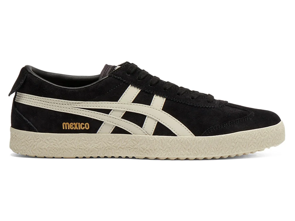 The MEXICO 66 DELEGATION embodies a blend of classic elegance and modern functionality. Based on the model worn by the Japanese team at the 1968 Mexico Games, it features a vintage-inspired suede upper combined with a lightweight, durable sole, reinterpreted with a refined and simple design. The vibrant suede leather adds a touch of flair and offers a soft, comfortable fit. The "MEXICO" mark on the side and the graphic of an athletics track on the insole reflect attention to detail throughout. The brand’s own soft insoles provide firm heel support, ensuring comfort even during extended wear. This design is perfect not only for daily use but also for special occasions, adding an element of sophistication to your look. This timeless model, cherished across generations, is ready to become a staple in your collection. DETAIL INFORMATION - Brand: Onitsuka Tiger - Country of Manufacture: Indonesia - Part No: 1183C344 - 1183C344.001 BLACK/CREAM - Upper material/surface: LEATHER - Outer Sole Material: ELASTOMER
