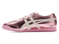 "METALLIC SERIES" from "MEXICO 66 SD" featuring the bold impact of the metallic color. The entire upper is made from recycled leather that balances softness with durability. By layering metallic foil over the recycled leather, the design achieves a vivid shine while also being environmentally conscious. The heel flap, adorned with hand stitching, is designed to prevent the rise of the heel flap and reduce the contact on the foot, supporting a comfortable fit. The lineup includes a total of six colors, featuring bold metallic colors. These sneakers express a unique individuality while embodying the strength, luxury, and fashion sense characteristic of Onitsuka Tiger. Country of Manufacture : Vietnam / Indonesia DETAIL INFORMATION - Brand: Onitsuka Tiger - Part No: 1183C468 - 1183C468.700 CRYSTAL PINK/CREAM - Upper material/surface: LEATHER / RECYCLED LEATHER - Outer Sole Material: RUBBER