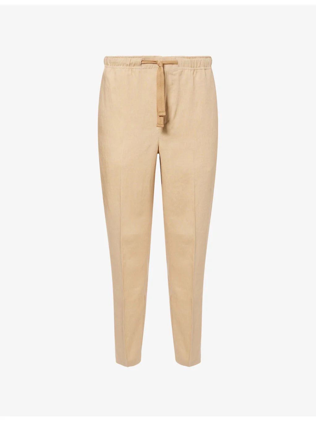 PRODUCT DETAILS - Orlebar Brown linen trousers - 100% linen; lining 100% cotton - Exposed button and concealed hook-and-eye and zip-fly fastening at front - Relaxed fit, elasticated drawcord waistband, tapered leg, two side slip pockets, pressed creases at leg, nickel-effect hardware, tonal zigzag stitching at side seam, two rear patch pockets - Dry clean only - Size UK 30: rise 10in / 25cm, inside leg 30in / 76cm, leg opening 16in / 41cm - Model is 6ft 2in/1.88m and wears a size UK 30 - Lightweight, non-stretch Ref: R04548899