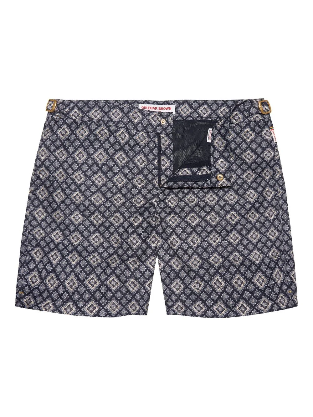 Bulldog geometric-patterned swim shorts Highlights - Navy blue - Geometric motif - Side pockets - Adjustable waist straps - Internal mesh lining - Be mindful to try on swimwear over your own garments. Imported Composition Outer: Recycled Polyester 100% Lining: Polyester 100% Washing instructions Machine Wash