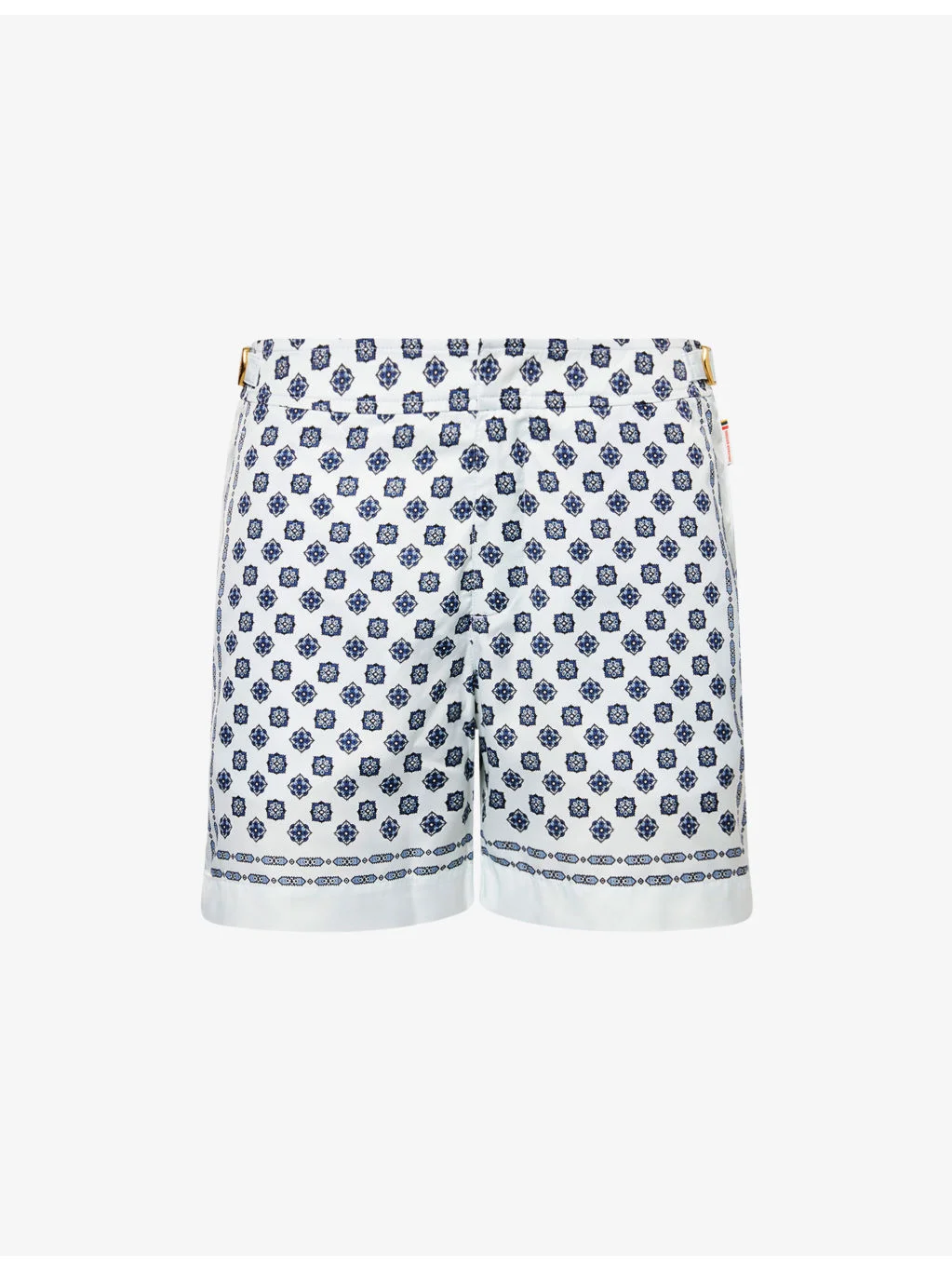 PRODUCT DETAILS - Orlebar Brown swim shorts - 100% polyamide; mesh lining 100% polyester - Concealed popper and zip-fly fastenings at front - Mid-rise, branded silver-toned adjustable buckle-belts at waist, two slip pockets at front, one zip pocket at back, all-over print - Machine wash cold - Model is 6ft 2in/1.88m and wears a size UK 30 - Midweight, non-stretch Ref: R04548906