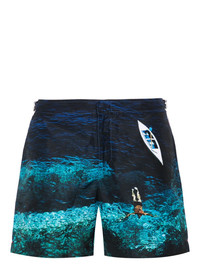 Bulldog photograph-print swim shorts Designed by Orlebar Brown in a tonal blue colourway, these swim shorts are decorated with a photographic print that inspired the name 'Deep Sea'. Highlights - Navy blue/turquoise blue-green - Fast-drying - ‘deep sea’ photograph print - Waist tabs - Two side slash pockets - Logo tag to the side - Short side slits - Thigh-length - Rear zip-fastening pocket - Locker loop to the rear - Mesh lining - Front press-stud and zip fastening - Be mindful to try on swimwear over your own garments. - This piece comes complete with a protective dust bag. Imported Composition Outer: Polyester 100% Lining: Polyester 100% Washing instructions Hand Wash