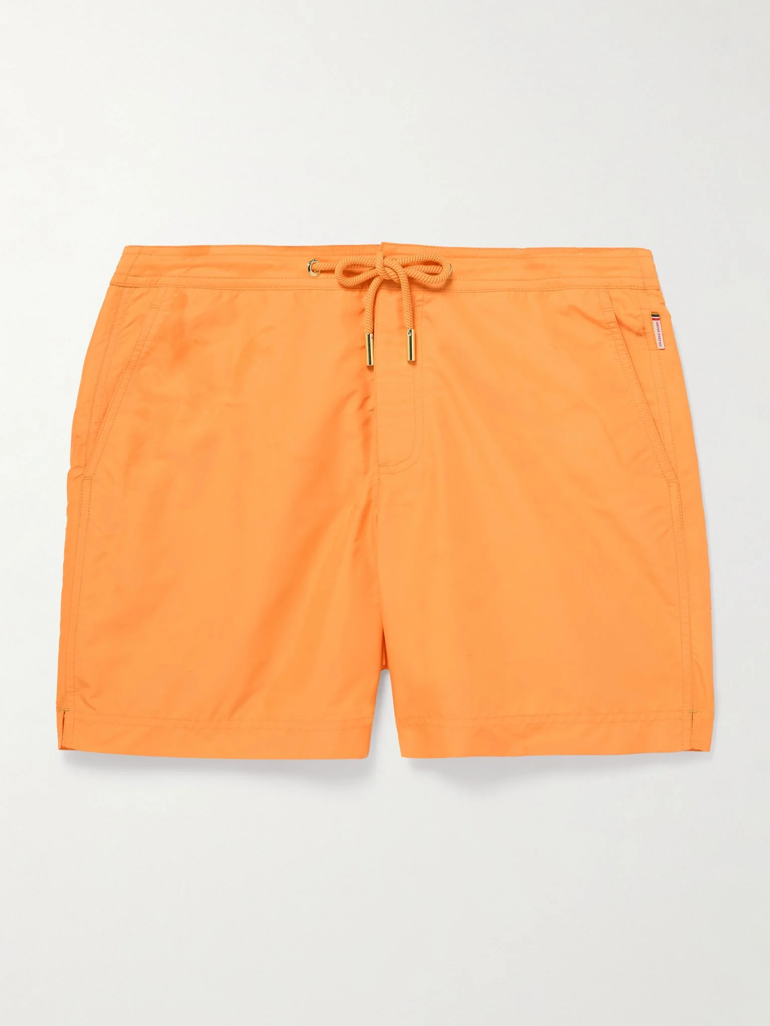 Orlebar Brown's signature 'Bulldog' swim shorts are built for holiday, whether it's a trip to the Caribbean or the Cote d’Azur. In a bold 'Calypso Orange' shade, this pair is cut from lightweight, quick-drying shell and has a drawstring waistband to adjust the fit. Size & Fit - Fits true to size. Take your normal size - Regular-straight leg, mid-rise style - Mid-length - Drawstring waist - Built-in mesh briefs - Adjustable tabs at the waist - Model is shown wearing a M - Model measures: waist size 32, height 6'2"/ 188cm Details & Care - Bright-orange recycled-shell - Snap and zip fastening - 100% recycled polyester - Machine wash - Designer colour: Calypso Orange