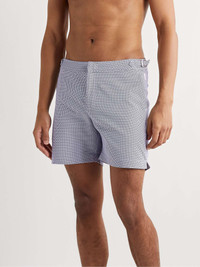 Orlebar Brown's 'Fenella' swim shorts are part of the brand's 'Bulldog X' collection, which is all about the smart details and refined patterns that make them suitable for wearing to lunch and sightseeing, as well as by the pool. They're made from Italian nylon that's jacquard-woven in a geometric motif and have adjustable waist tabs. Size & Fit - Fits true to size. Take your normal size - Slim cut, mid-rise style - Mid-length - Built-in mesh briefs - These swim shorts have adjustable tabs at the waist - Model wears a 32 - Model measures: waist size 32, height 6'1"/ 185cm Details & Care - White and navy nylon - Adjustable waist tabs, two front slash pockets, back zipped pocket, designer emblem, locker loop, side slits, mesh lining - Snap and zip fastening - 100% nylon; lining: 100% polyester - Machine wash - Designer colour: Navy/ Cloud - Come with a waterproof bag