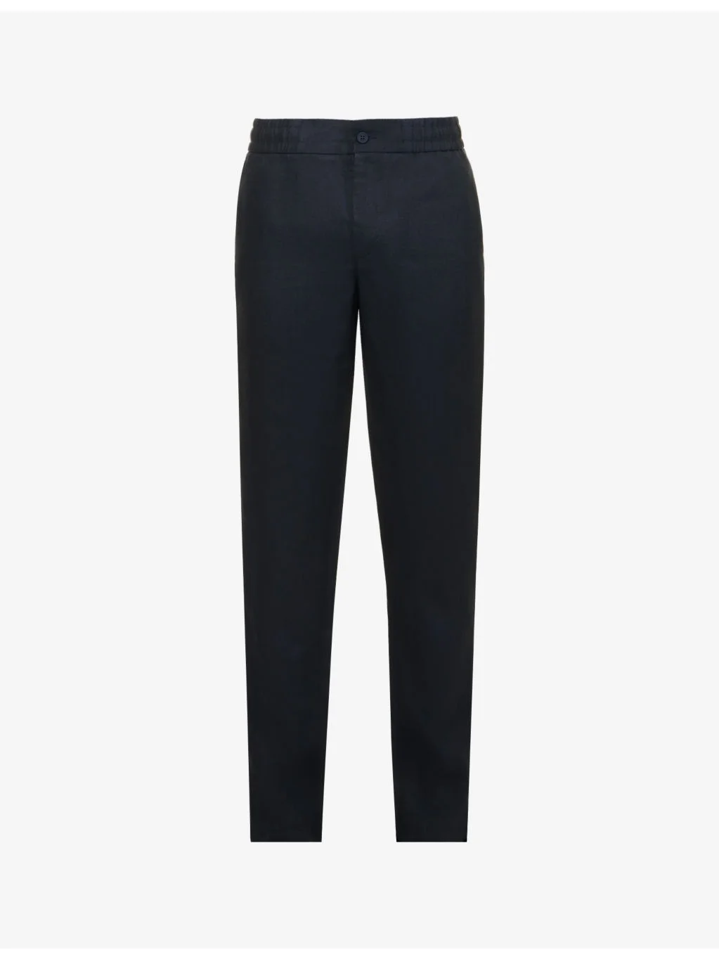 PRODUCT DETAILS - Orlebar Brown linen trousers - 100% linen - Exposed button and concealed zip-fly fastening at front - Regular fit, mid-rise, tapered leg, elasticated drawstring waist, two slip pockets at sides, darts at back, two jetted pockets at back, branded hardware, partially lined - Machine wash cold - Made in Portugal - Size UK 30: rise 11in / 28cm, inside leg 32in / 81cm, leg opening 14in / 36cm - Model is 6ft 2in/1.88m and wears a size UK 30 - Lightweight, non-stretch Ref: R04150087