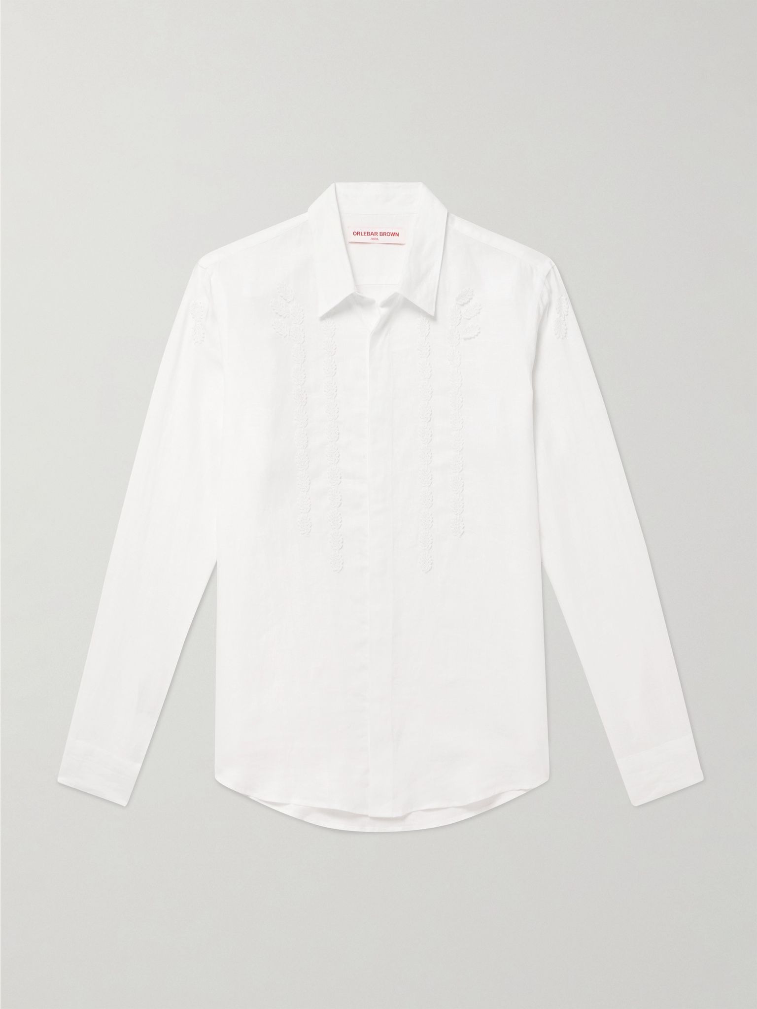 Orlebar Brown's 'Giles' shirt has a vintage feel, with floral appliques that run through the chest. It's cut for a loose fit from airy linen that's perfect for the warmer months. Size & Fit - Fits true to size. Take your normal size - Designed for a loose fit - Lightweight, non-stretchy fabric - Model is shown wearing a M - Model measures: chest 38"/ 96cm, height 6'3"/ 191cm Details & Care - White linen - Button fastenings - 100% linen