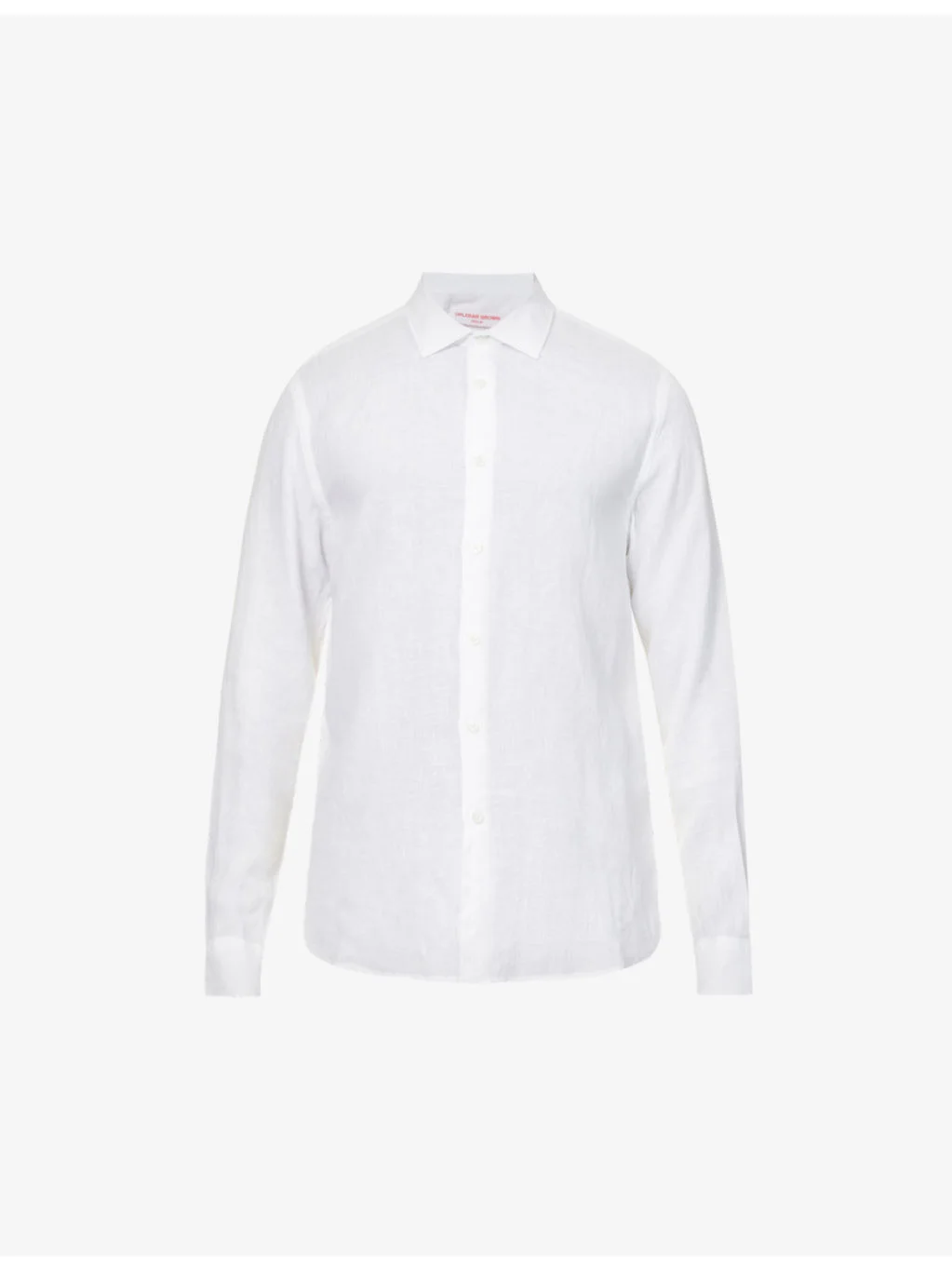 PRODUCT DETAILS - Orlebar Brown linen shirt - 100% linen - Exposed button fastenings at front - Spread collar - Long sleeve, double-buttoned cuffs, pearlescent buttons, all-over woven texture, tonal stitching, curved hem - Machine wash cold - Made in Portugal - Size medium: length 30in / 76cm, chest 36in / 91cm - Model is 6ft 1in/1.85m and wears a size medium - Lightweight, non-stretch