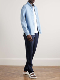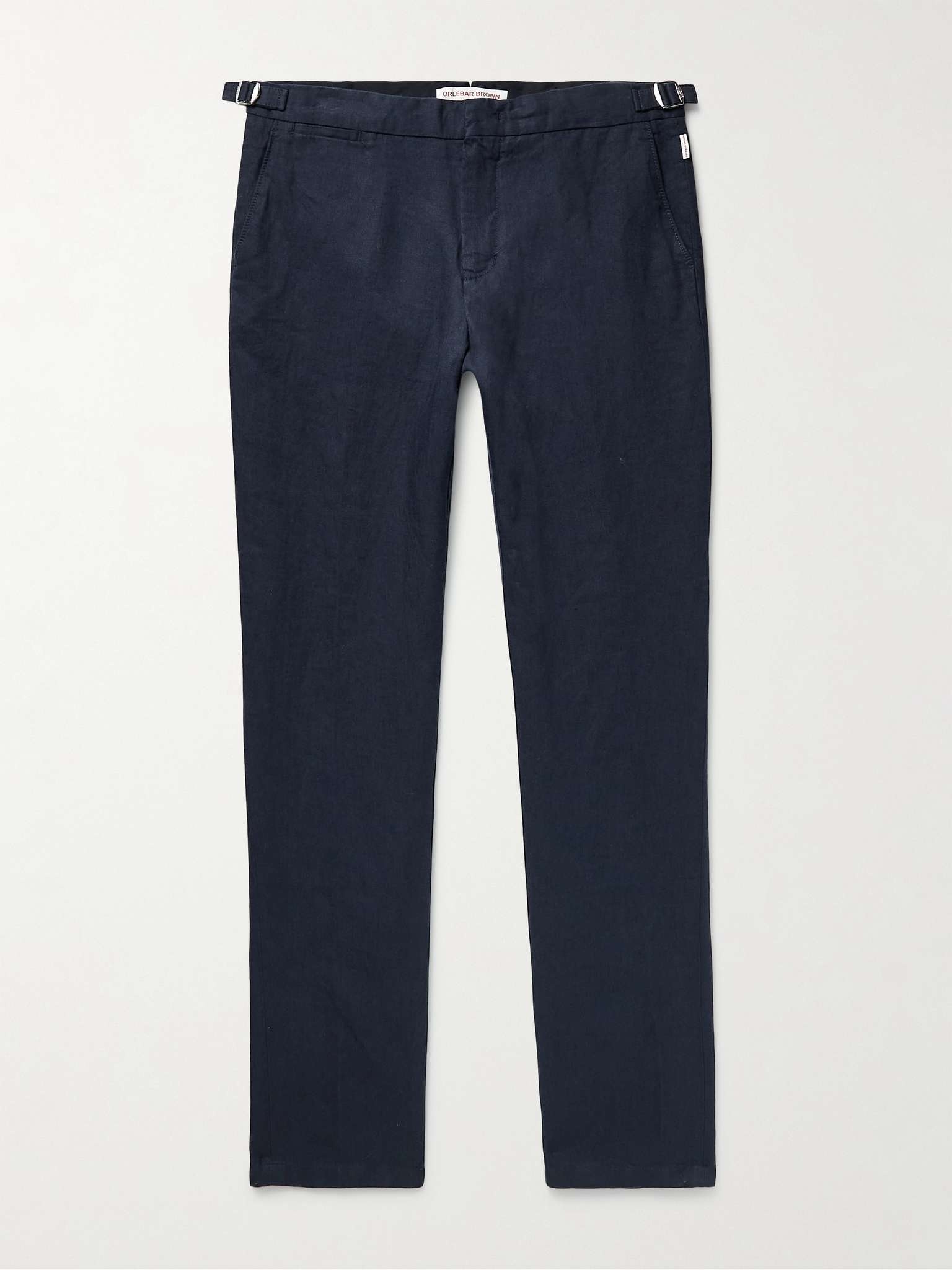 Orlebar Brown's 'Griffon' trousers are cut from airy linen that's practical for warm months. Inspired by tailored styles, they have adjustable tabs at the waist so you can find a fit that's just right. Pair yours with a simple tee or camp-collar shirt. Size & Fit - Model wears a size larger to achieve a looser fit - Relaxed slim cut, mid-rise trousers - Adjustable tabs at the waist - Lightweight, non-stretchy fabric - Model is shown wearing a 32 - Model measures: waist size 30, height 6'2"/ 188cm Details & Care - Navy linen - Hook and zip fastening - 100% linen; lining: 100% cotton - Machine wash