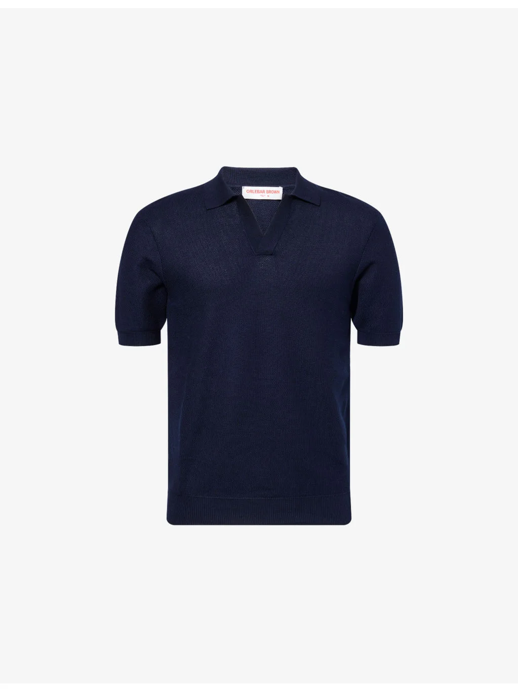 PRODUCT DETAILS - Orlebar Brown knitted polo top - 100% cotton - Pointed collar, short sleeves, V-neck opening, honeycomb knitted texture, striped embroidered detailing at side, ribbed trims - Machine wash at 30°C - Made in Italy - Model is 6ft 2in/1.88m and wears a size medium - Lightweight, non-stretch Ref: R04498451
