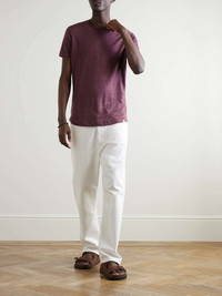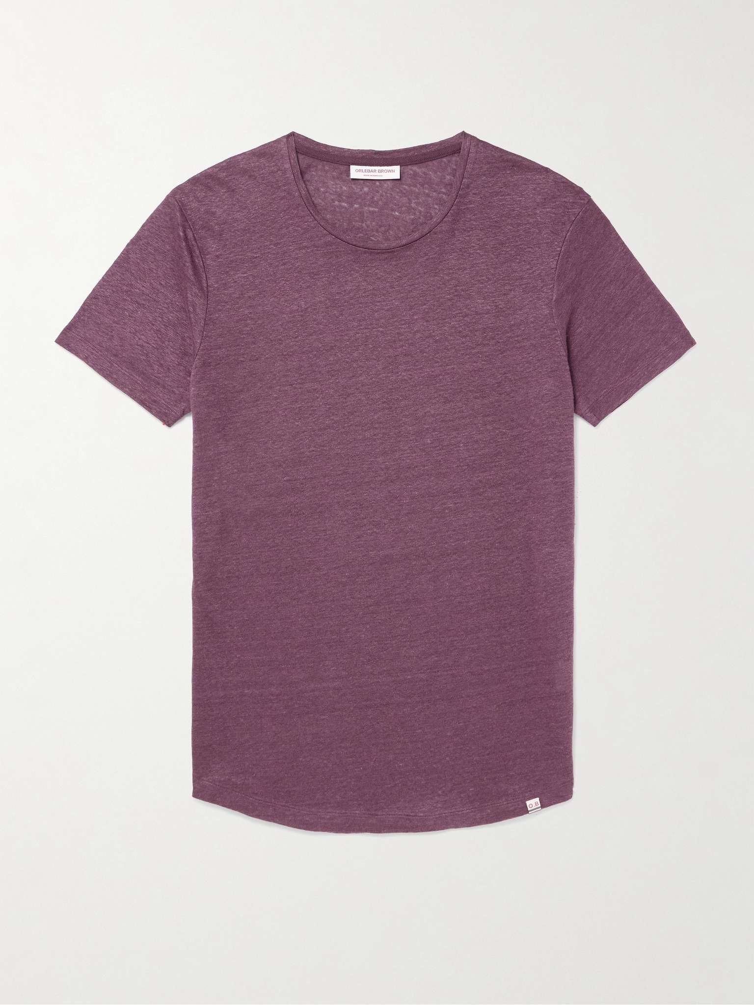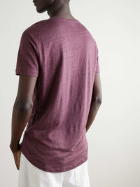 Orlebar Brown's 'OB-T' T-shirt is bound to become a favourite in your everyday wardrobe. The same style worn by James Bond in No Time To Die, it's cut from soft linen-jersey and finished with a rounded hem. Team it with loungewear for downtime or go with swim shorts on holiday. Size & Fit - Fits true to size. Take your normal size - Designed for a regular fit - Mid-weight, slightly stretchy fabric - Model is shown wearing a M - Model measures: chest 38"/ 96cm, height 6'2"/ 188cm Details & Care - Burgundy slub linen-jersey - 100% linen - Machine wash - Designer colour: Damson