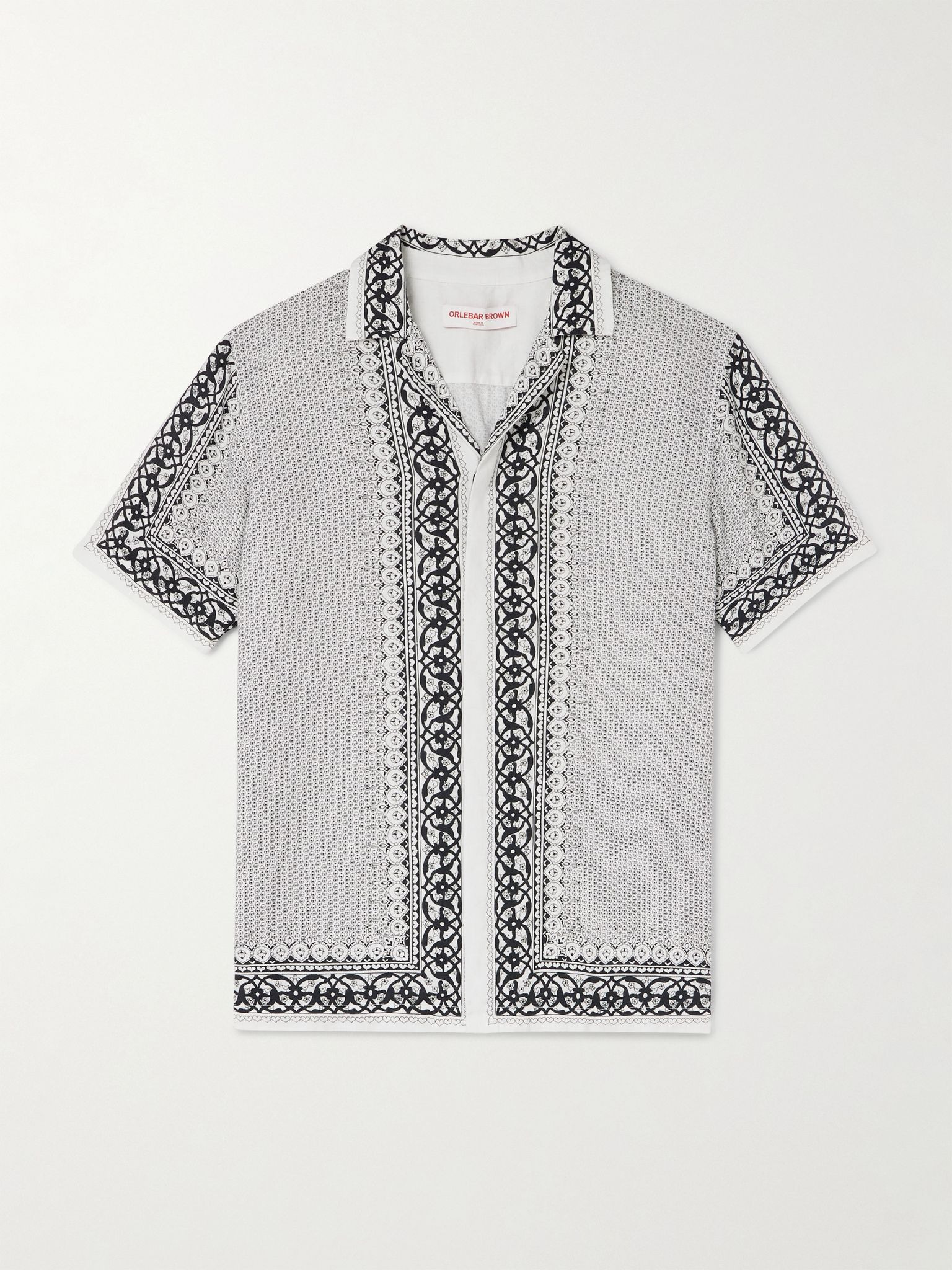 Tailored from pure cotton, Orlebar Brown's 'Maitan' shirt has a relaxed camp collar and is decorated with a bold tile-inspired print. Wear yours with swim, denim or chino shorts. Size & Fit - Fits true to size. Take your normal size - Designed for a relaxed fit - Mid-weight, non-stretchy fabric - Model is shown wearing a M - Model measures: chest 38"/ 96cm, height 6'3"/ 191cm Details & Care - White and black cotton - Button fastenings - 100% cotton - Designer colour: White Sand